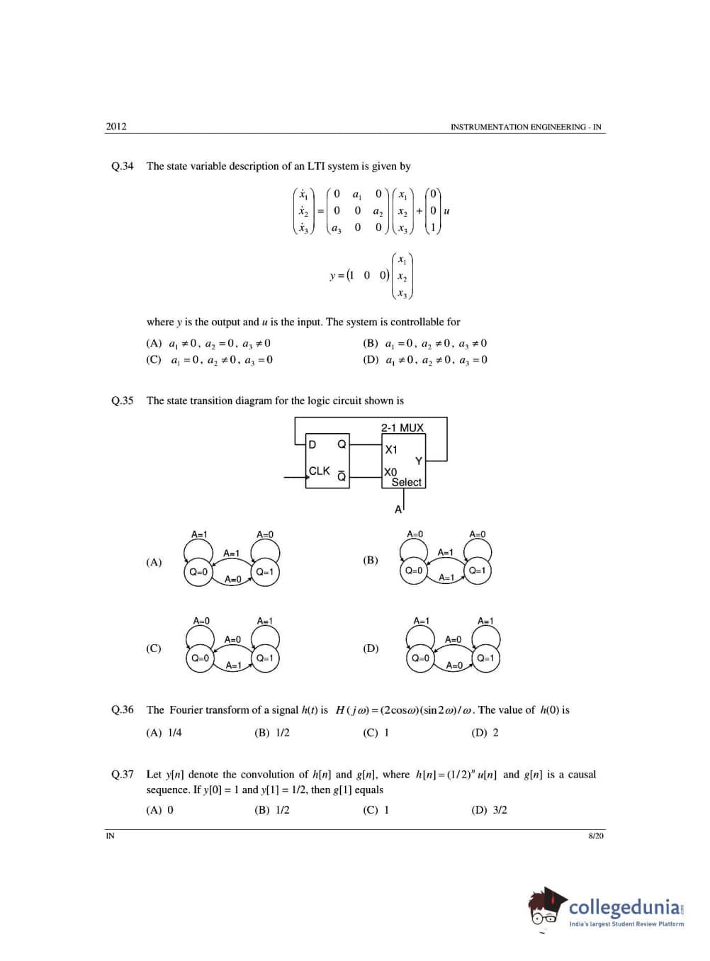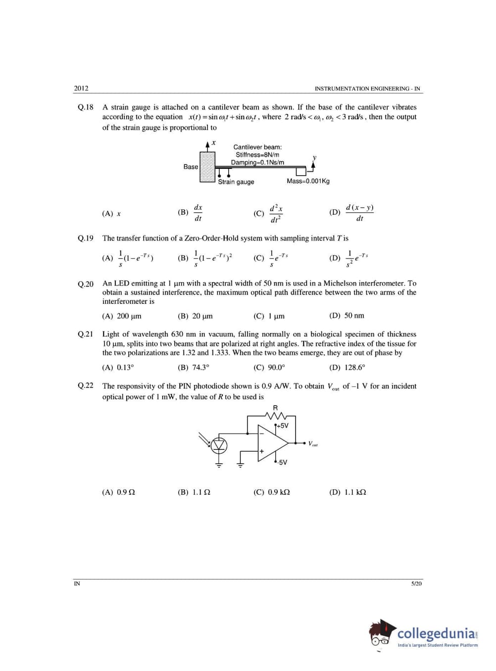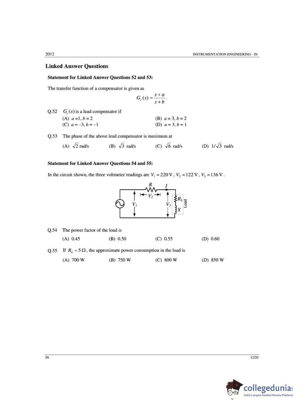 GATE 2012 Instrumentation Engineering (IN) - Offline Question Paper with Answer Key PDFs -Afternoon Session