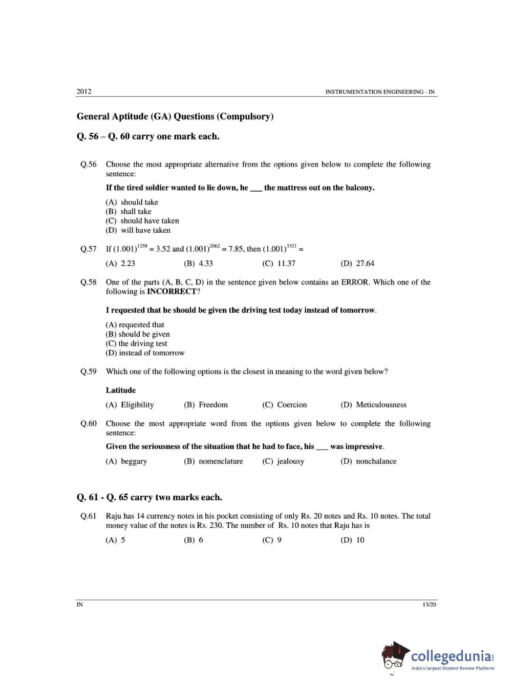 GATE 2012 Instrumentation Engineering (IN) - Offline Question Paper with Answer Key pdf is available for download. The exam was conducted by IIT Delhi on Feb-12 in the Afternoon Session. The question paper comprised a total of 65 questions from General Aptitude and Instrumentation Engineering (IN) - Offline topics.