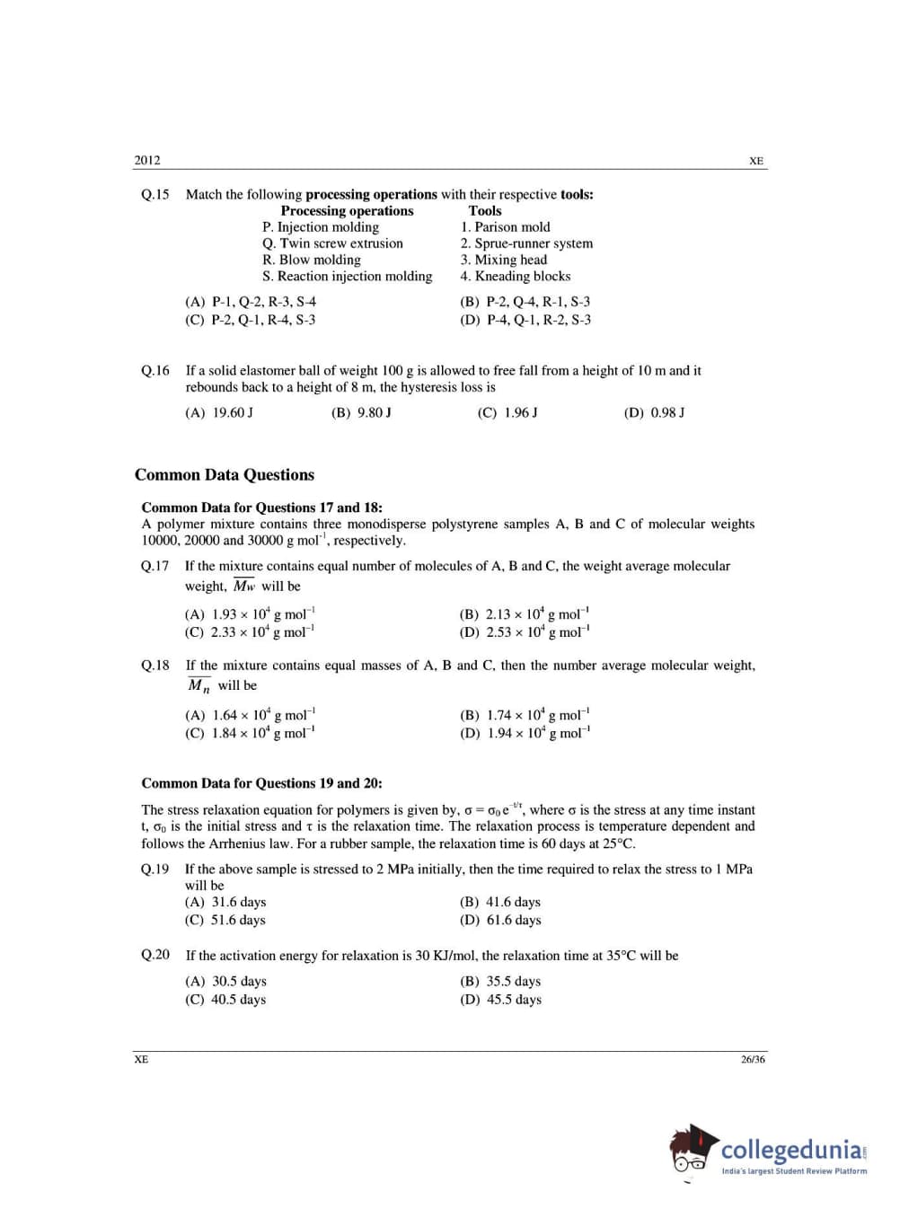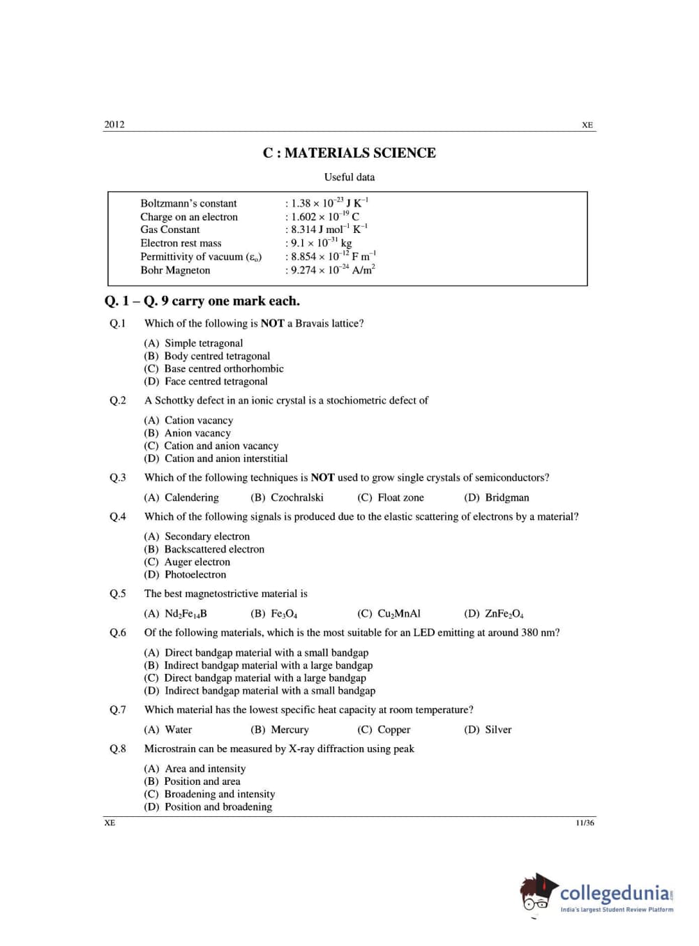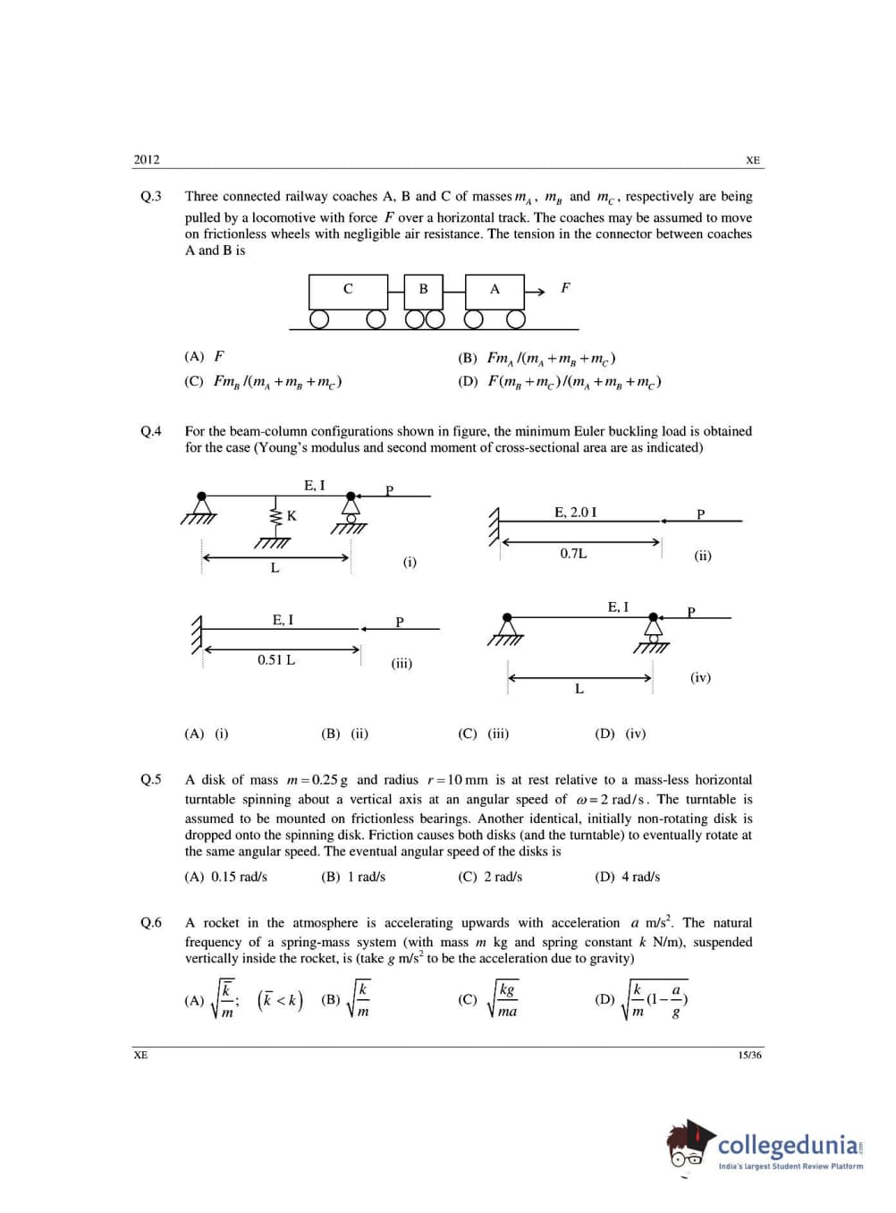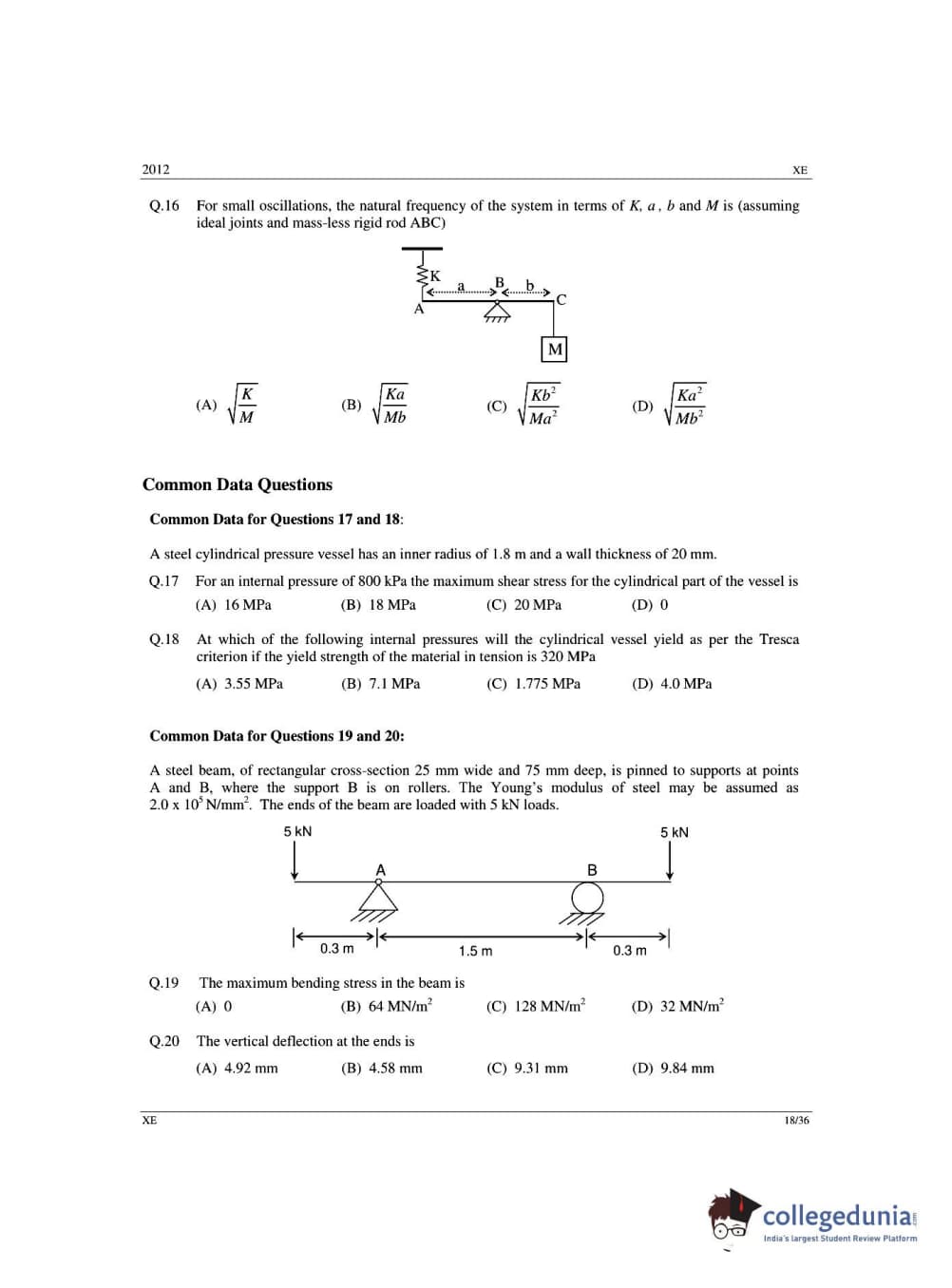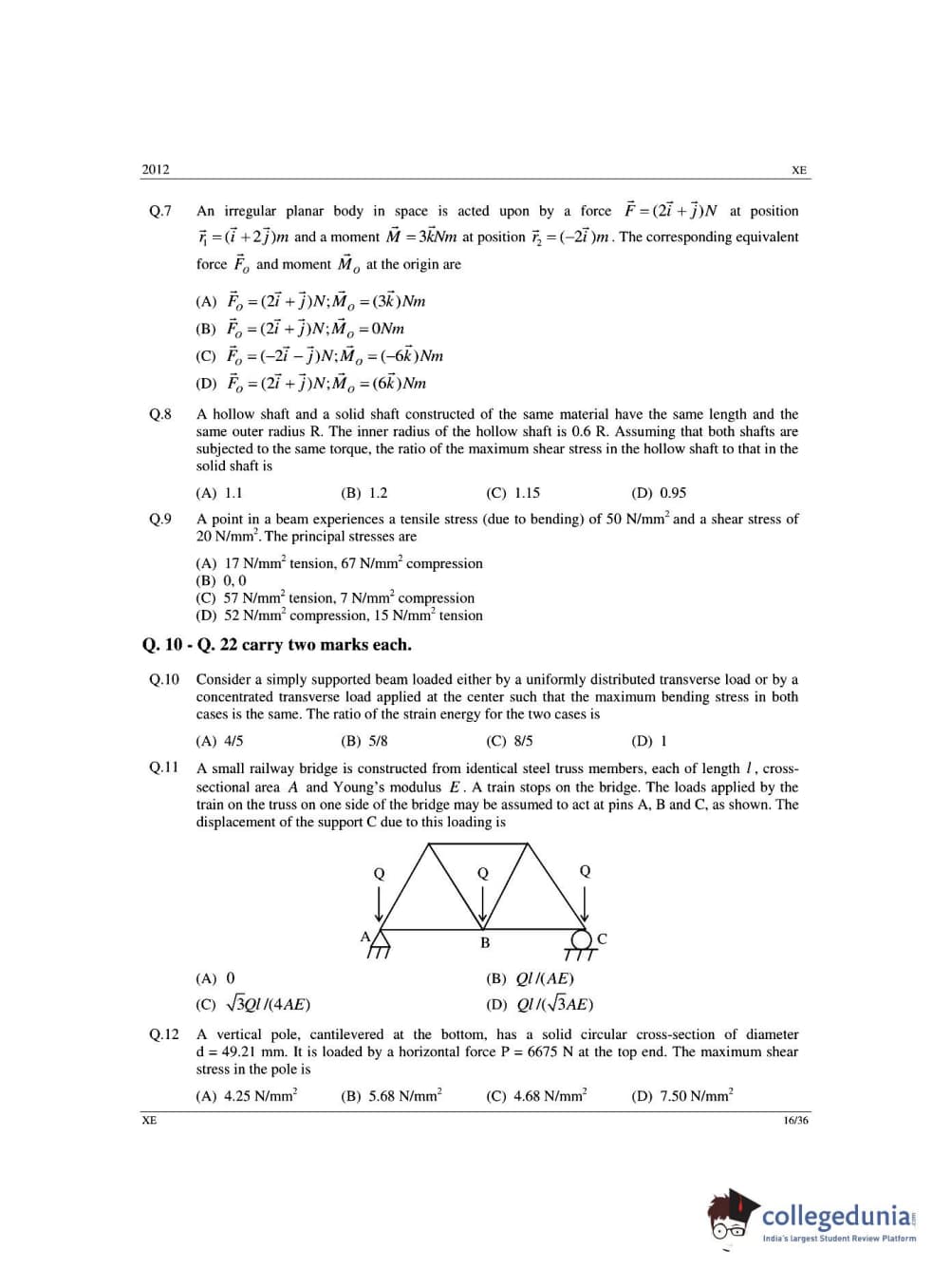 GATE 2012 Engineering Sciences (XE) Question Paper with Answer Key PDFs are available for download. GATE 2012 was conducted by the Indian Institute of Technology in Delhi. GATE 2012 XE Paper had a total of 65 questions conducted for a total of 100 marks. GATE 2012 XE Paper consisted of 55 question from core discipline subject- Engineering Sciences and 10 questions from General Aptitude.