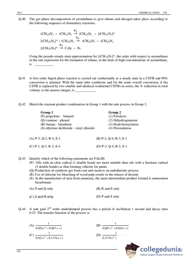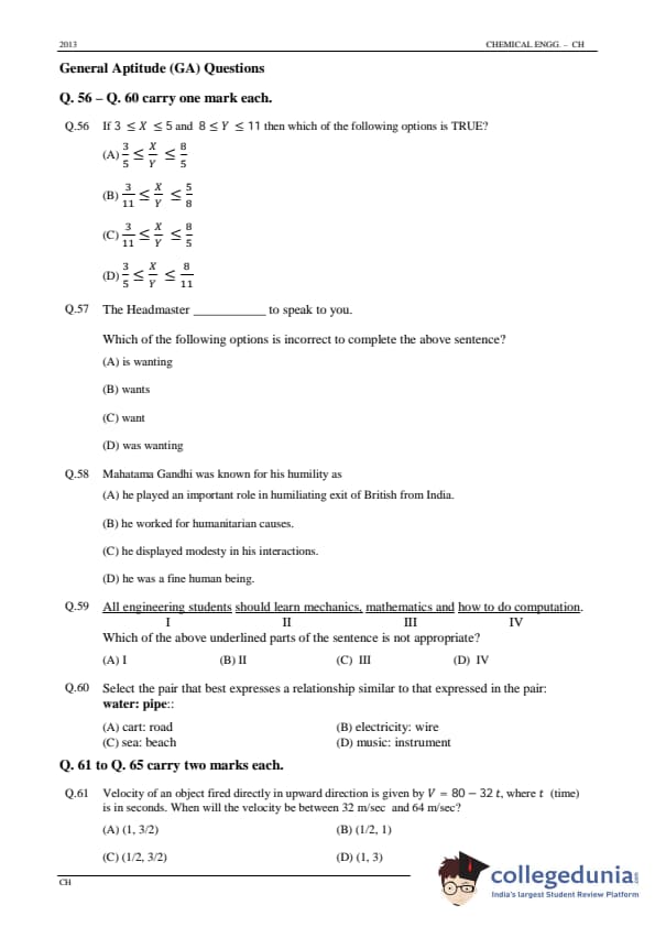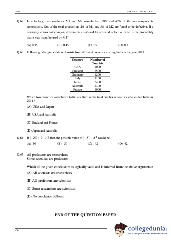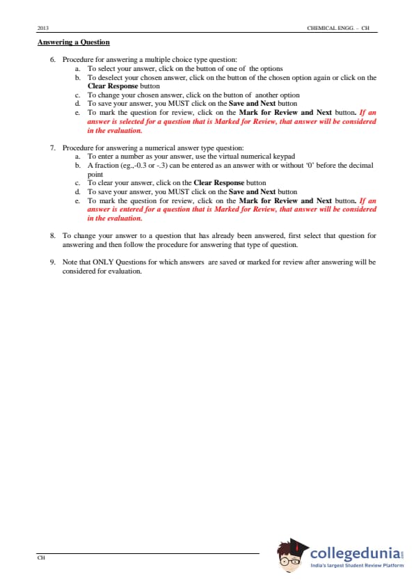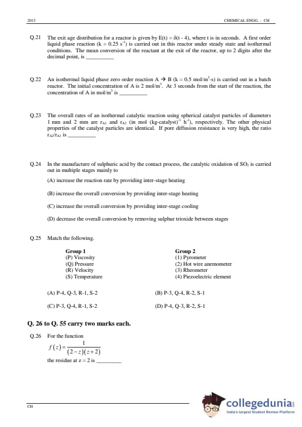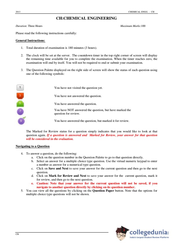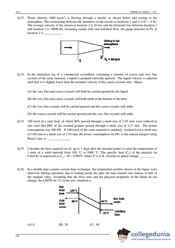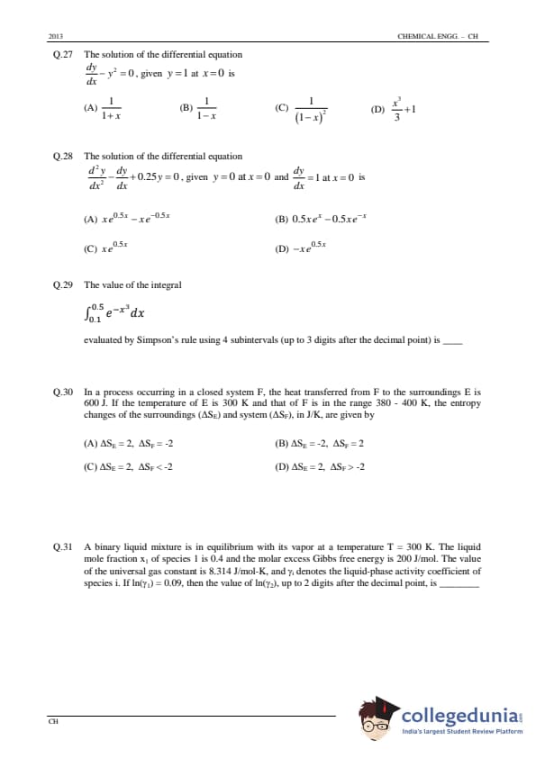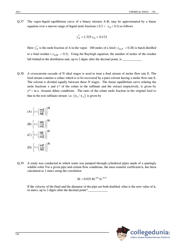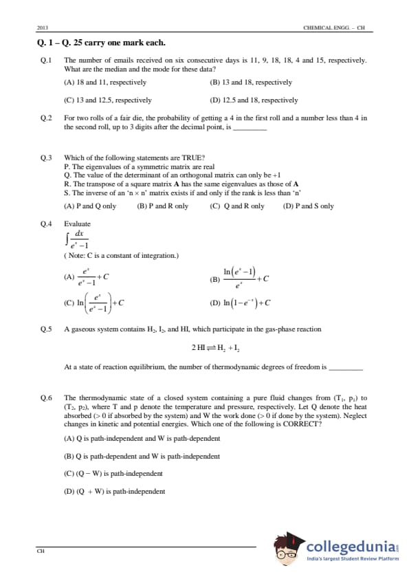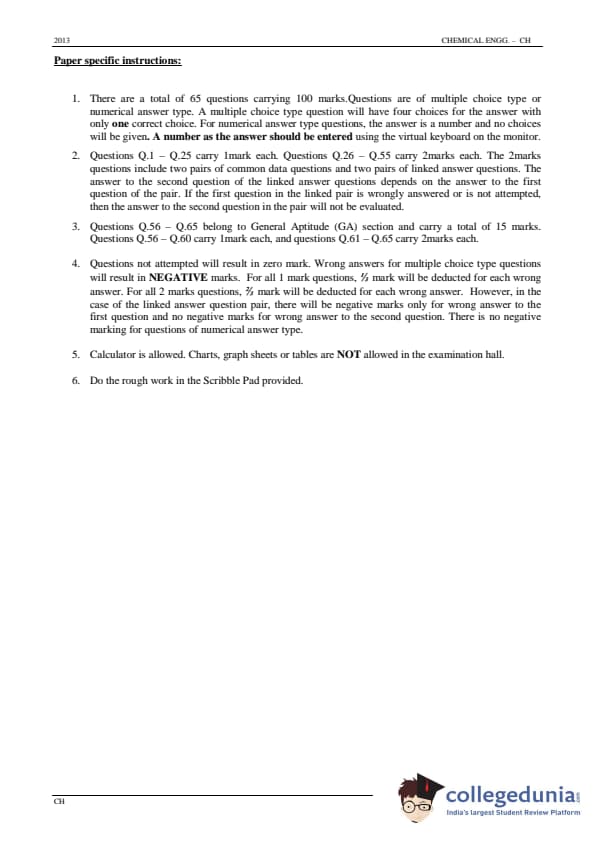 The question paper consisted of 40 MCQs (Multiple Choice Questions) and 25 NAT (Numerical Multiple Type) questions. The total marks of GATE 2013 CH exam were 100.
