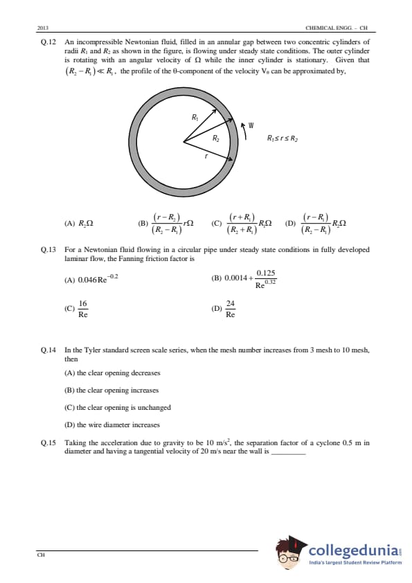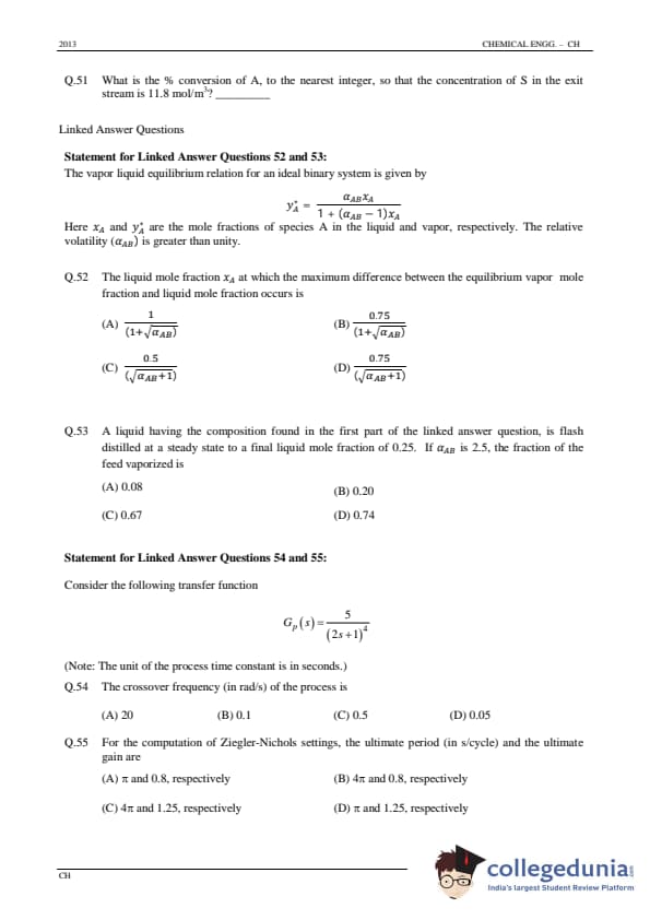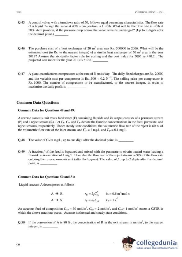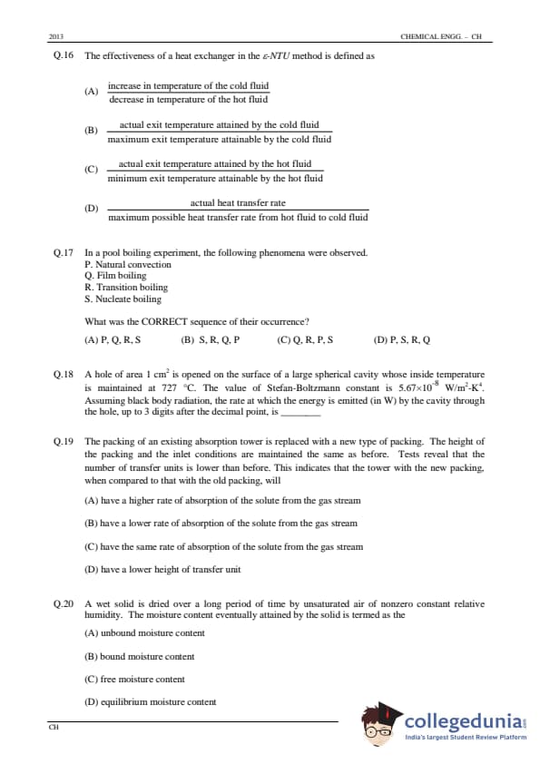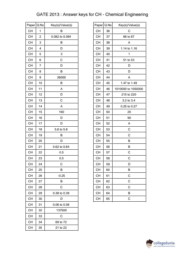 GATE 2013 CH Question Paper with Answer Key PDF is available for download. GATE 2013 exam for Chemical Engineering (CH) was conducted by IIT Bombay on January 20, 2013, in the afternoon session (2:00 pm to 5:00pm). GATE 2013 CH question paper was rated easy to moderate by the test-takers and experts alike. The 65 questions in the paper were divided into general aptitude (10 questions) and the core discipline (55 questions).