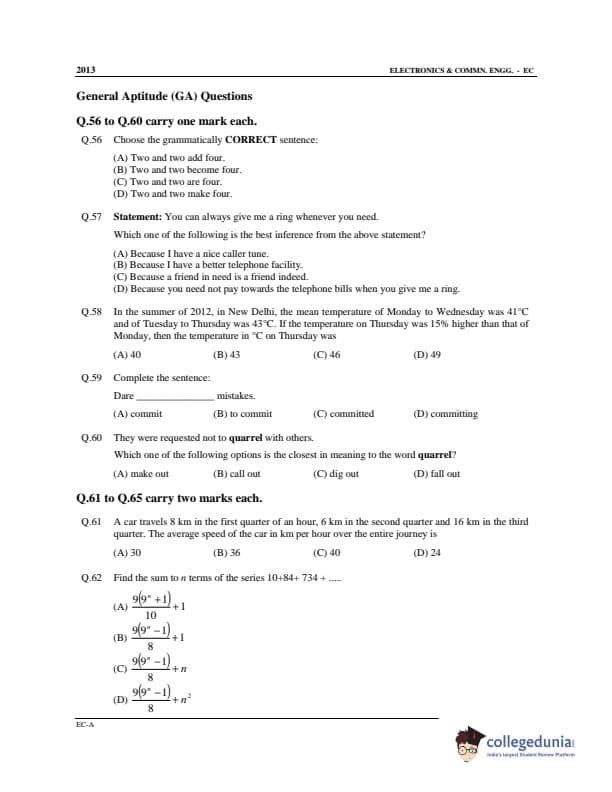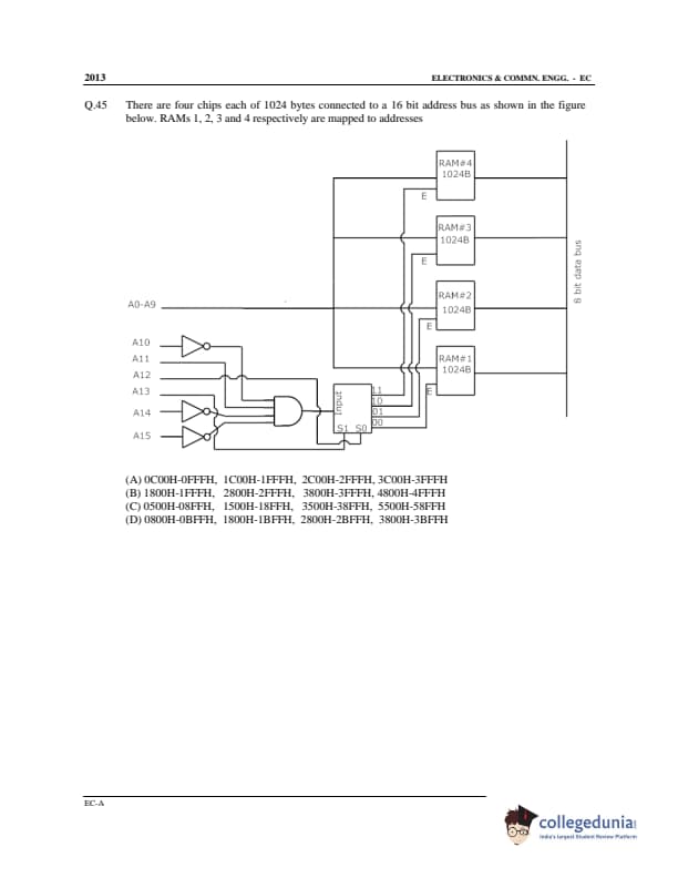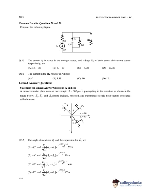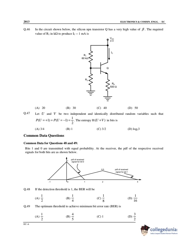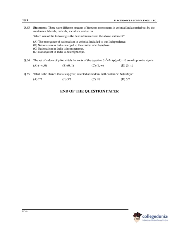 GATE 2013 Electronics and Communication Engineering (EC) Slot 1 - Offline Question Paper with Answer Key pdf is available for download. The exam was conducted by IIT Bombay on February 10 in the Afternoon Session. In terms of difficulty level, GATE Electronics and Communication Engineering (EC) Slot 1 - Offline was of Moderate to Difficult level. The question paper comprised a total of 65 questions from General Aptitude and Electronics and Communication Engineering (EC) Slot 1 - Offline topics.