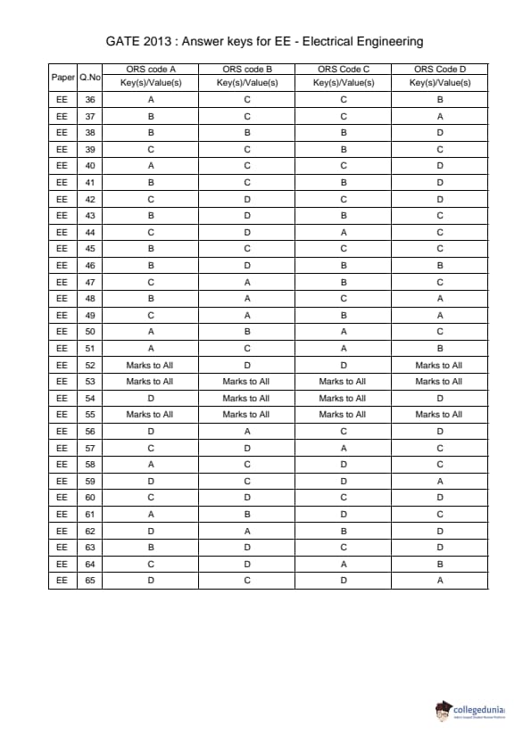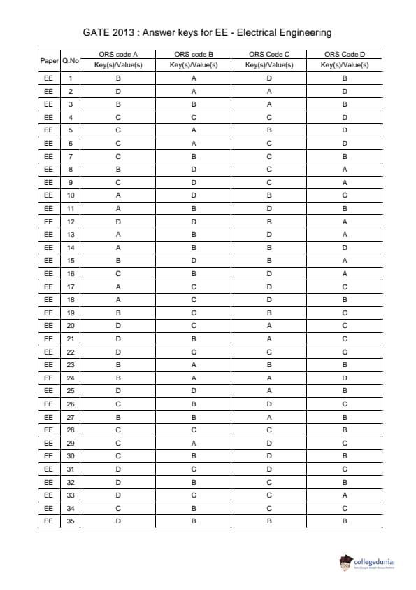 GATE 2013 Electrical Engineering (EE) Answer Key |
