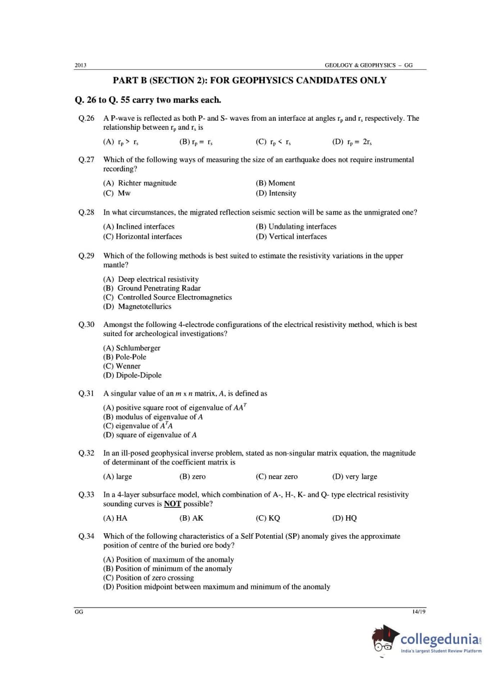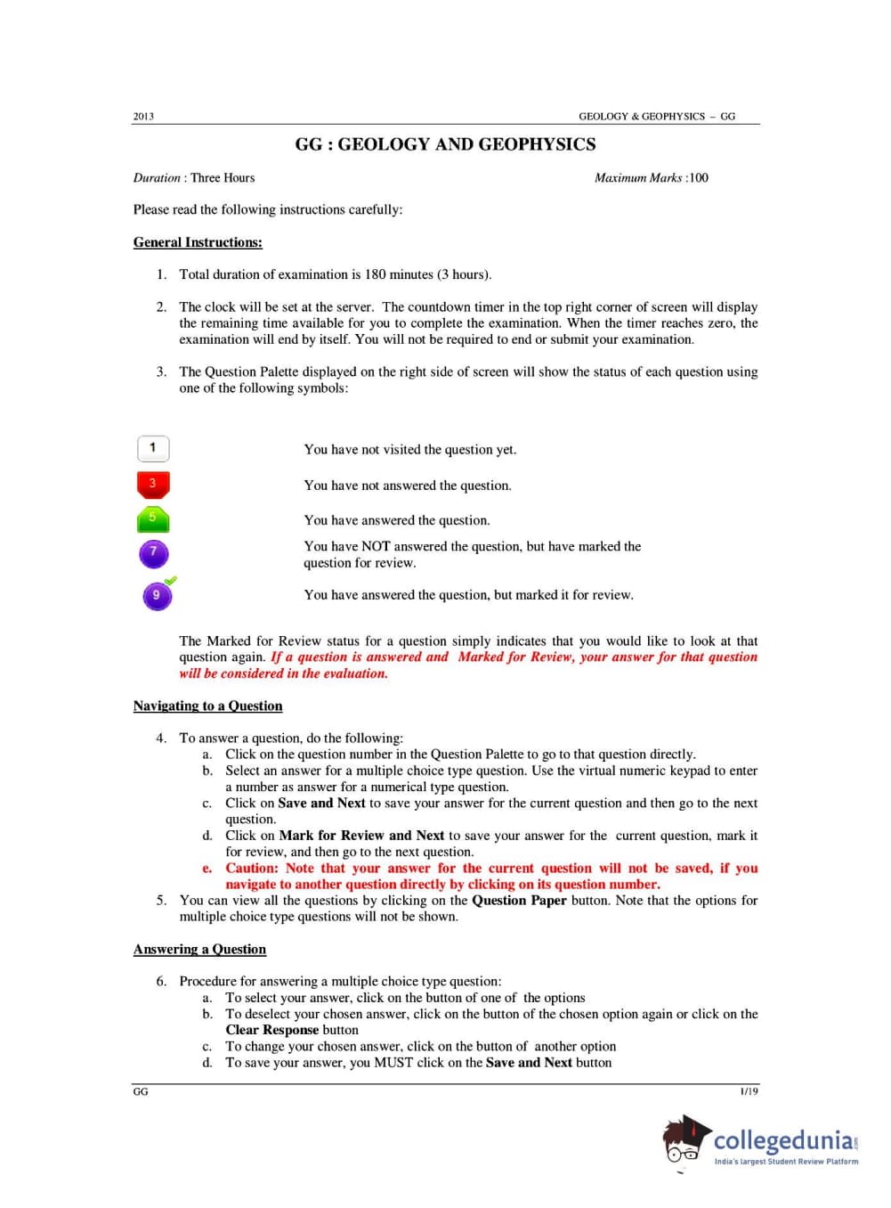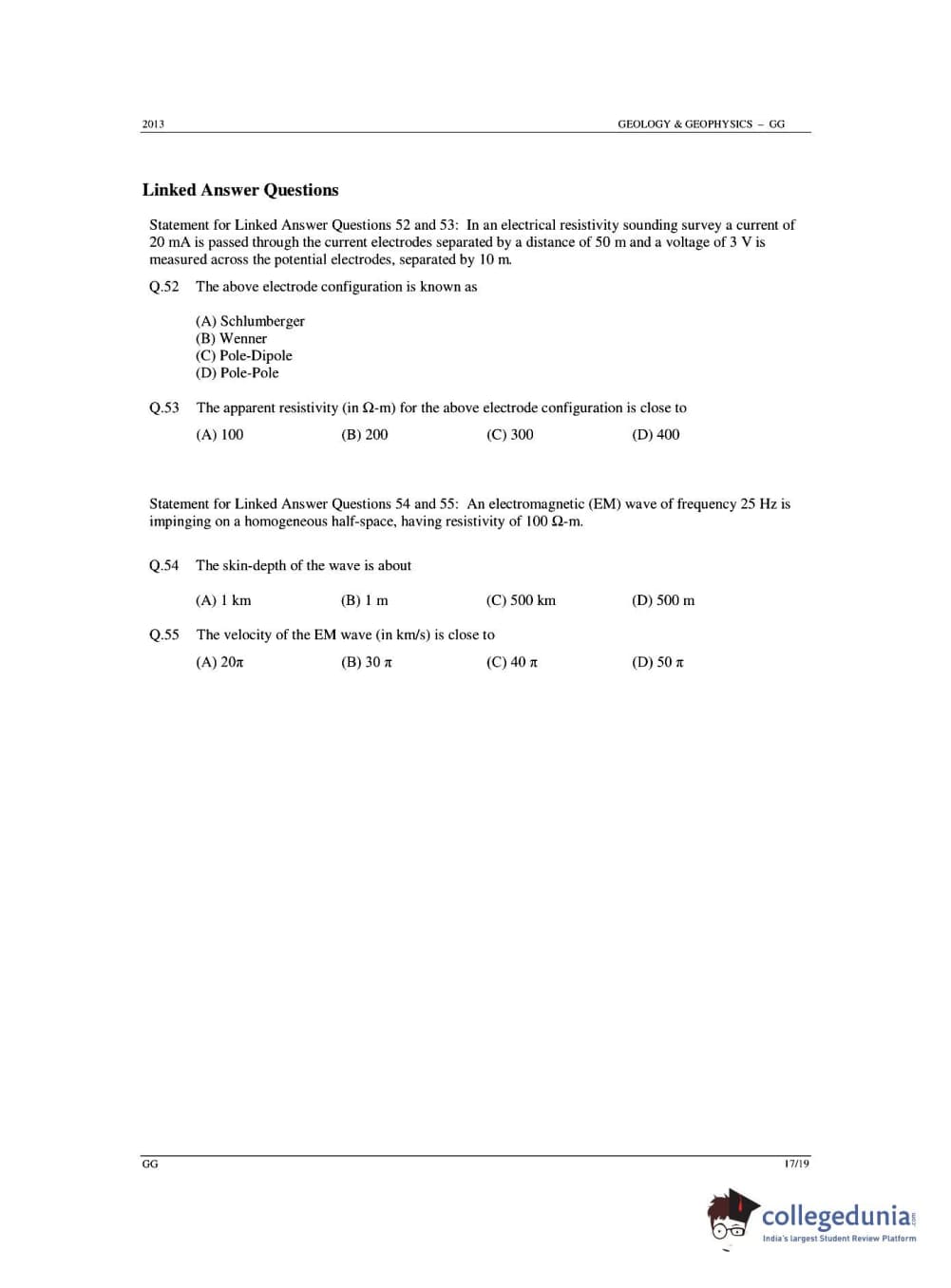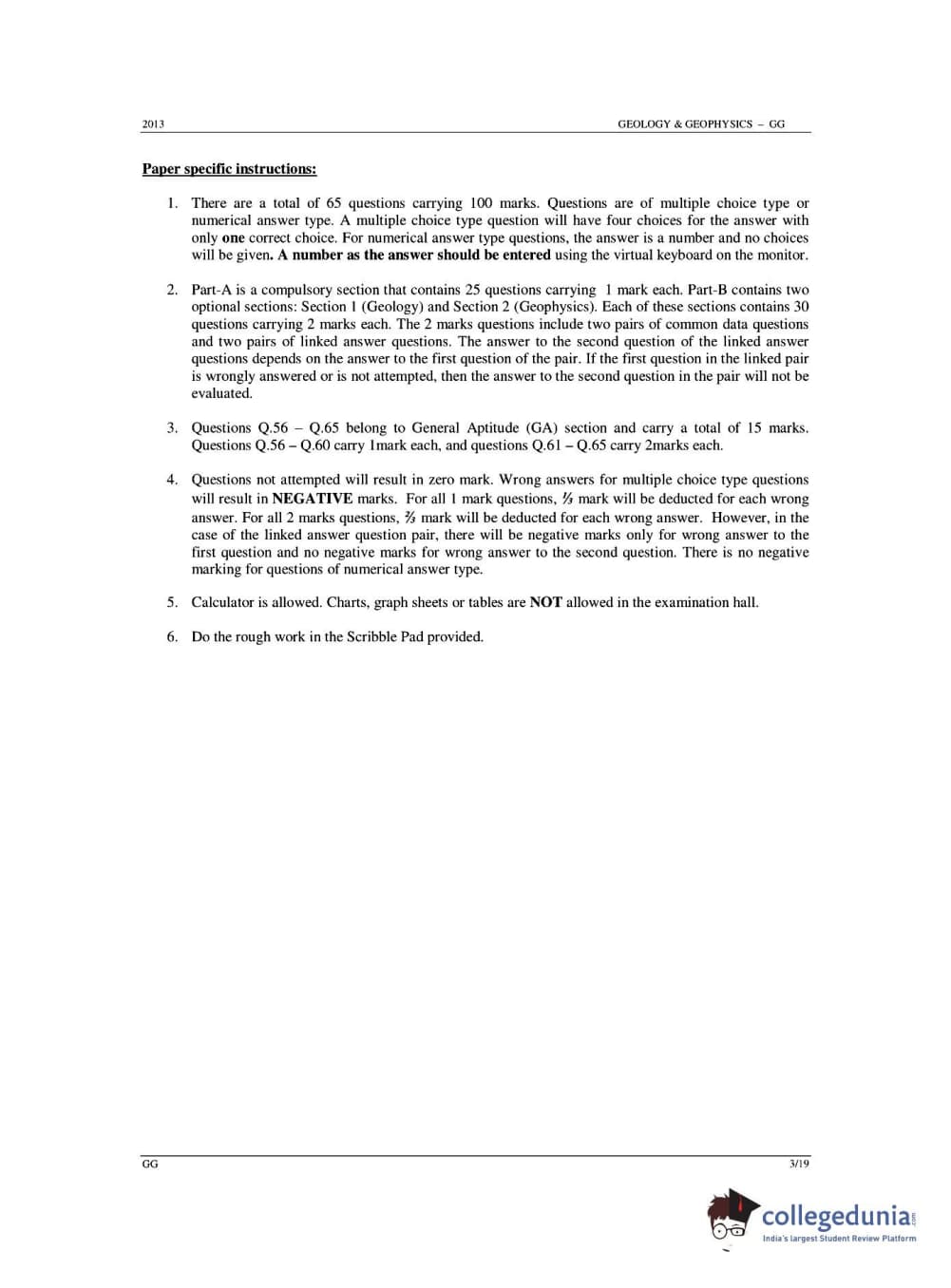 GATE 2013 Geology and Geophysics (GG) - Online Question Paper with Answer Key pdf is available for download. The exam was conducted by Indian Institute of Technology Bombay on Jan-20 in the Forenoon Session. The question paper comprised a total of 65 questions from General Aptitude and Geology and Geophysics (GG) - Online topics.