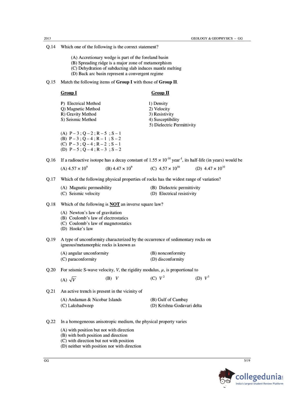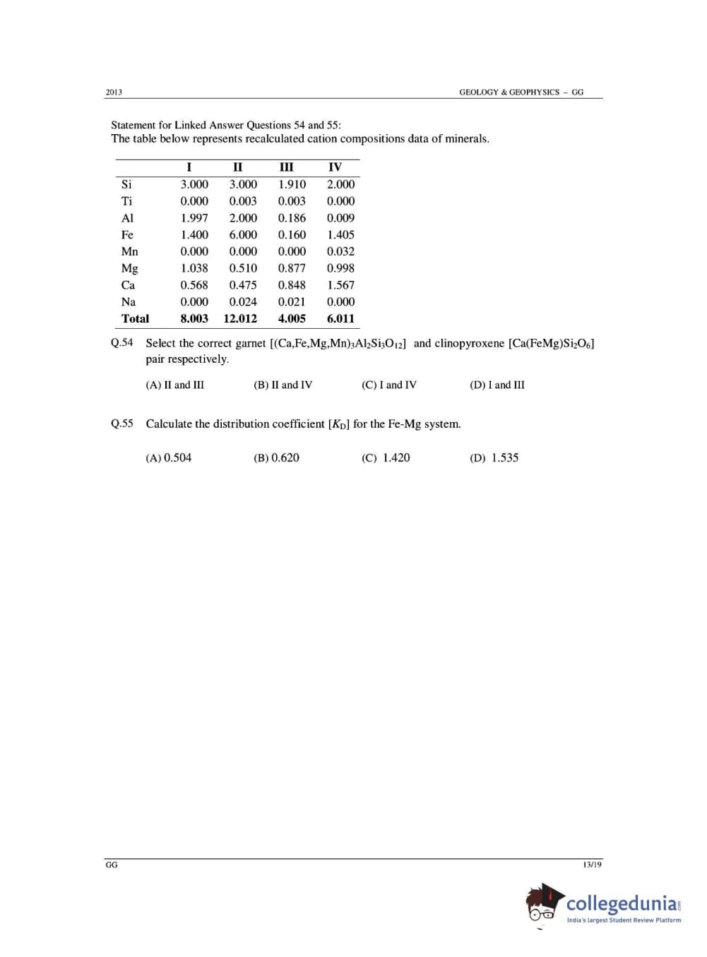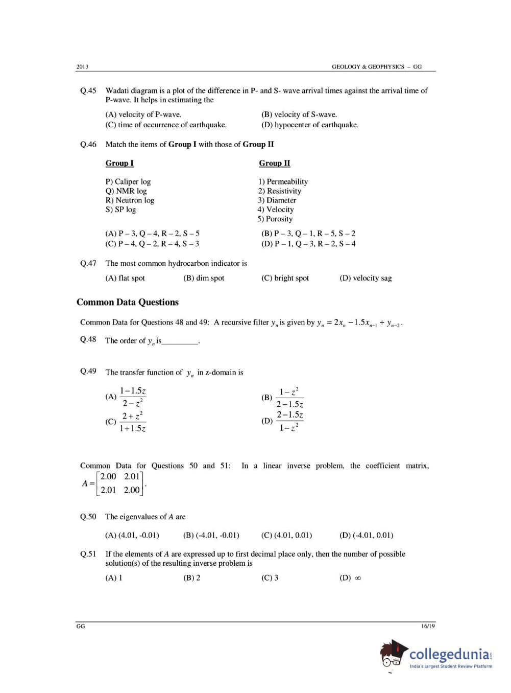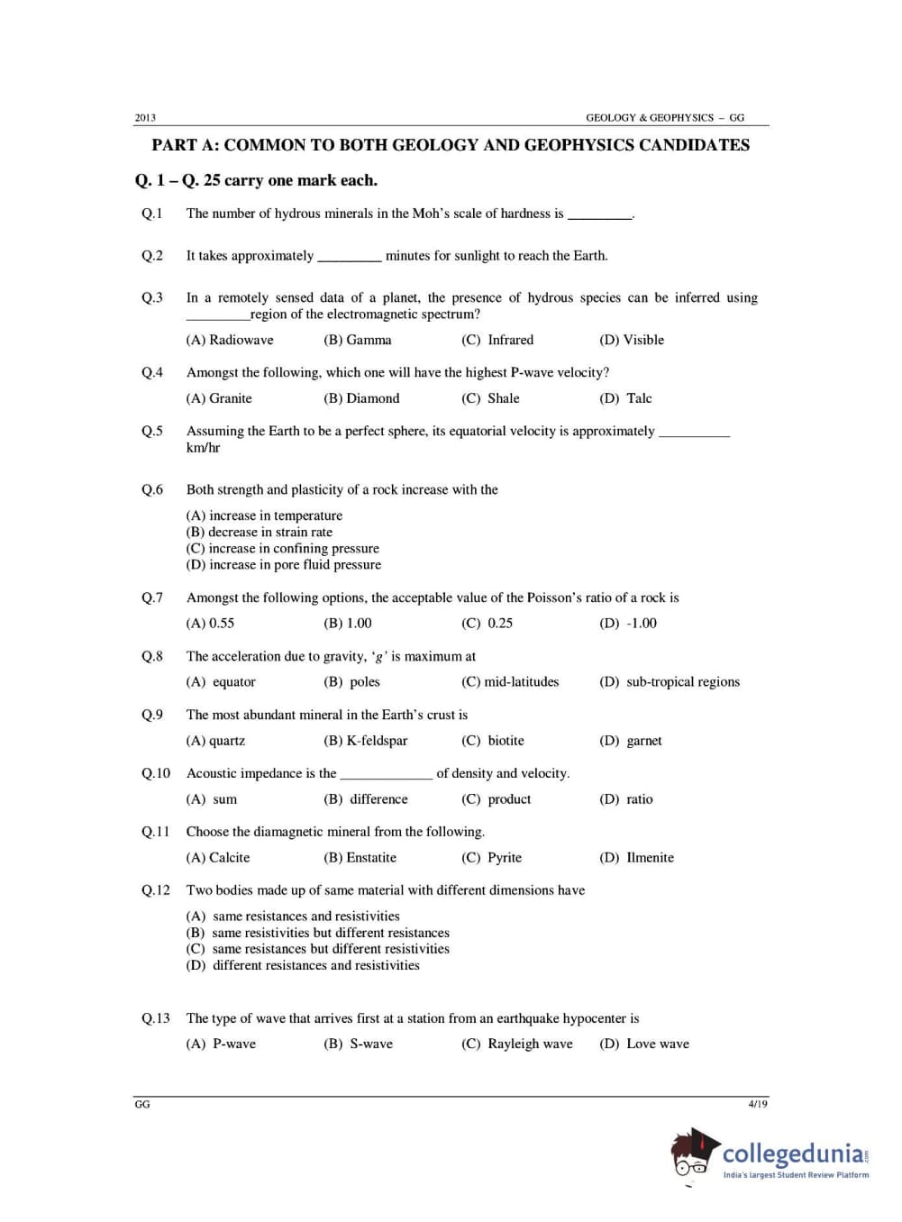 GATE 2013 Geology and Geophysics (GG) - Online Question Paper with Answer Key pdf is available for download. The exam was conducted by Indian Institute of Technology Bombay on Jan-20 in the Forenoon Session. The question paper comprised a total of 65 questions from General Aptitude and Geology and Geophysics (GG) - Online topics.