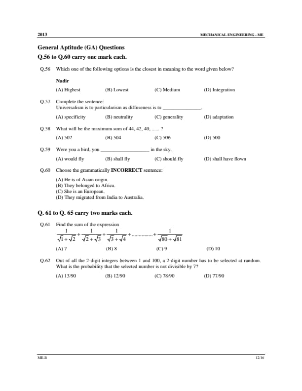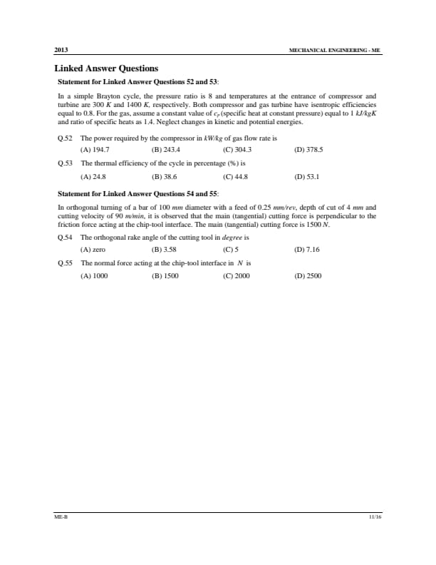 GATE 2013 ME Question Paper with Answer Key PDF Set B is available for download. GATE 2013 Mechanical Engineering (ME) exam was held in offline mode on February 10, 2013 and the answers had to be filled in the ORS sheet using a black pen. A total of 65 questions were asked and included 10 general aptitude questions. GATE 2013 ME question paper had questions from important topics like thermodynamics, fluid mechanics, and heat transfer. The paper was for a total of 100 marks.1/3rd mark was deducted for each incorrectly answered 1 mark question. For every incorrectly attempted 2 marks questions, 2/3rd marks were deducted. Questions left unattempted had no negative marking in GATE 2013 ME paper.