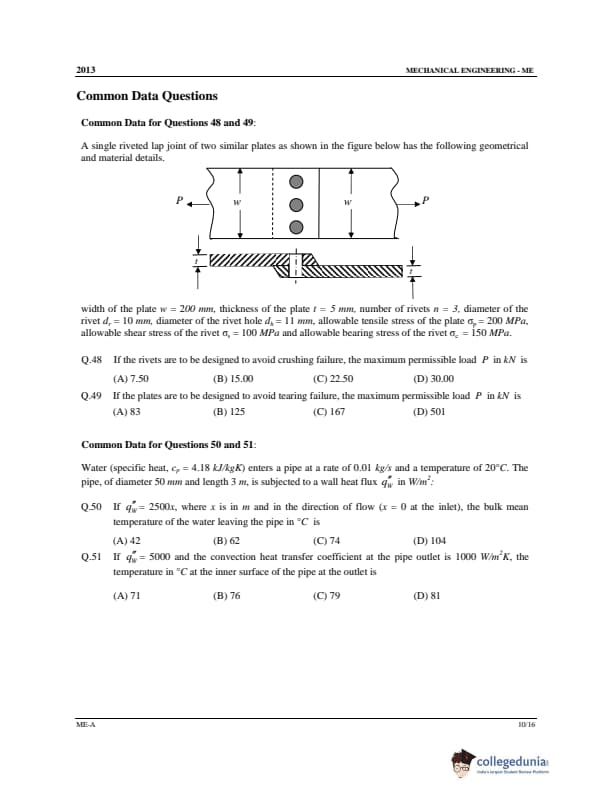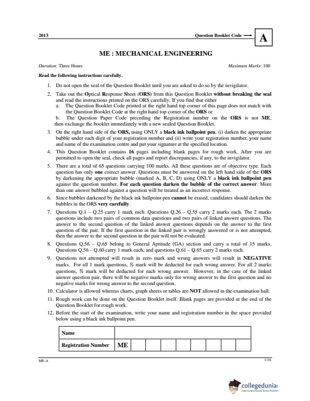 GATE 2013 ME Question Paper with Answer Key PDF Set A is available for download. GATE 2013 ME (Mechanical Engineering) exam was held on February 10, 2013 by IIT Bombay in offline mode. An Optical Response Sheet (ORS) was provided to the test-takers to mark the correct answers. A total of 65 objective-type questions worth 100 marks were asked- 10 belonged to General Aptitude and the remaining 55 belonged to the core discipline. GATE 2013 ME question paper was rated moderately difficult and fluid mechanics and applied engineering had a higher weightage.
