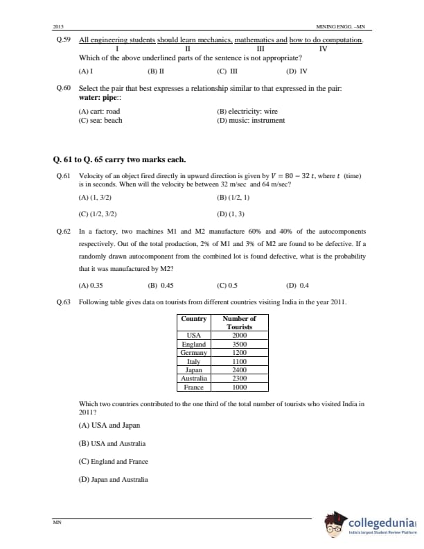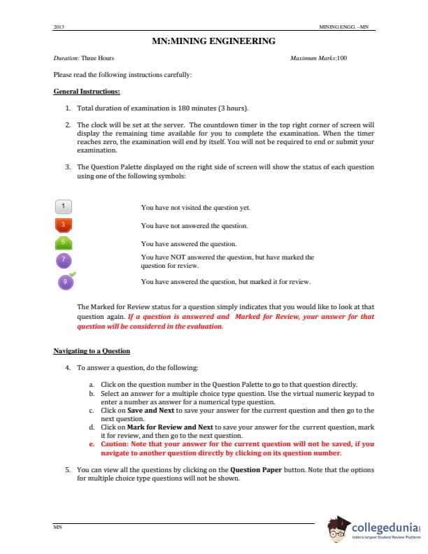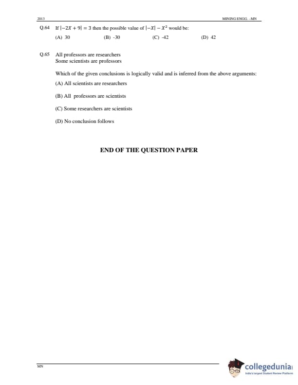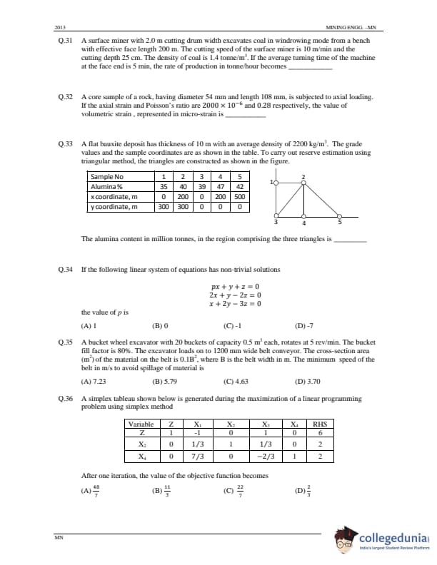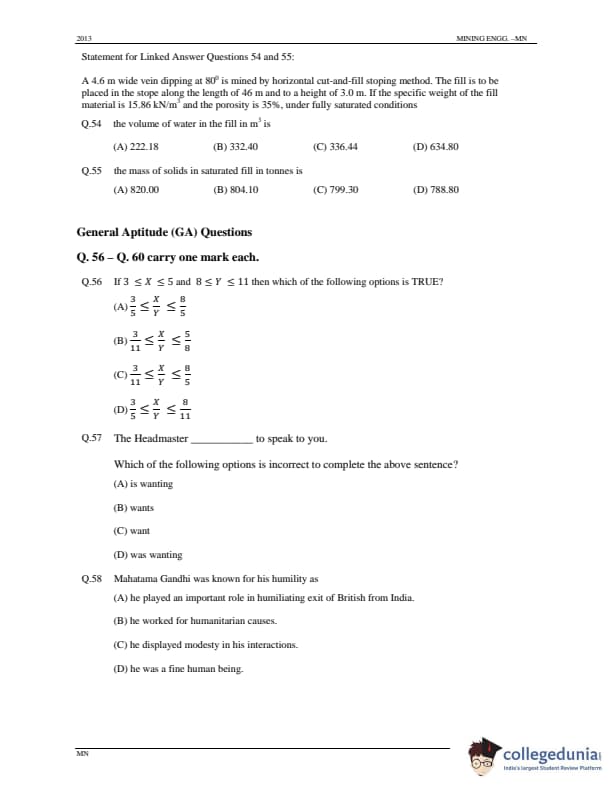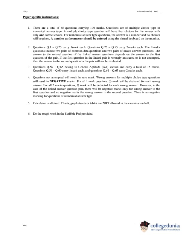 GATE 2013 MN Paper consisted of a total of 65 questions majorly classified into 2 sections - General Aptitude and Mining Subjects. The questions were a blend of Multiple Choice Questions and Numerical Answer Type (NAT) Questions. All the questions carried 1 or 2 marks if marked correct.