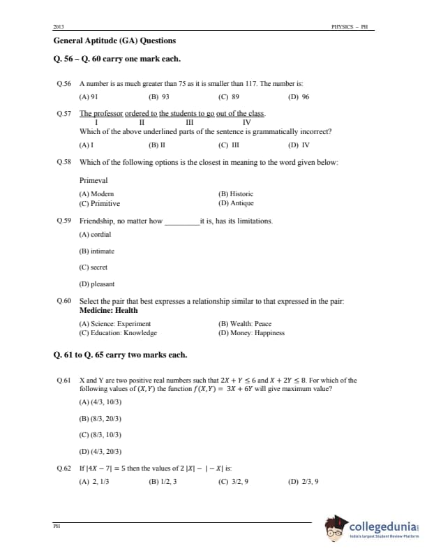 GATE 2013 Physics Question Paper is now available to download here. The exam was conducted by IIT Bombay on January 20, 2013 in the forenoon session. The question paper was divided into 2 sections, namely, General Aptitude [15 marks], and Physics [85 marks]. The question paper had a total of 65 questions which had a total of 100 marks with a time duration of 3 hours.