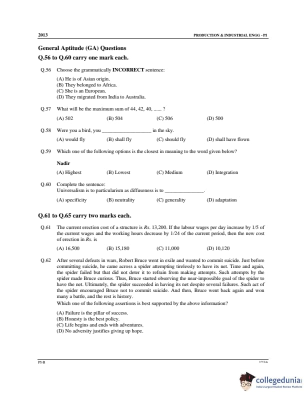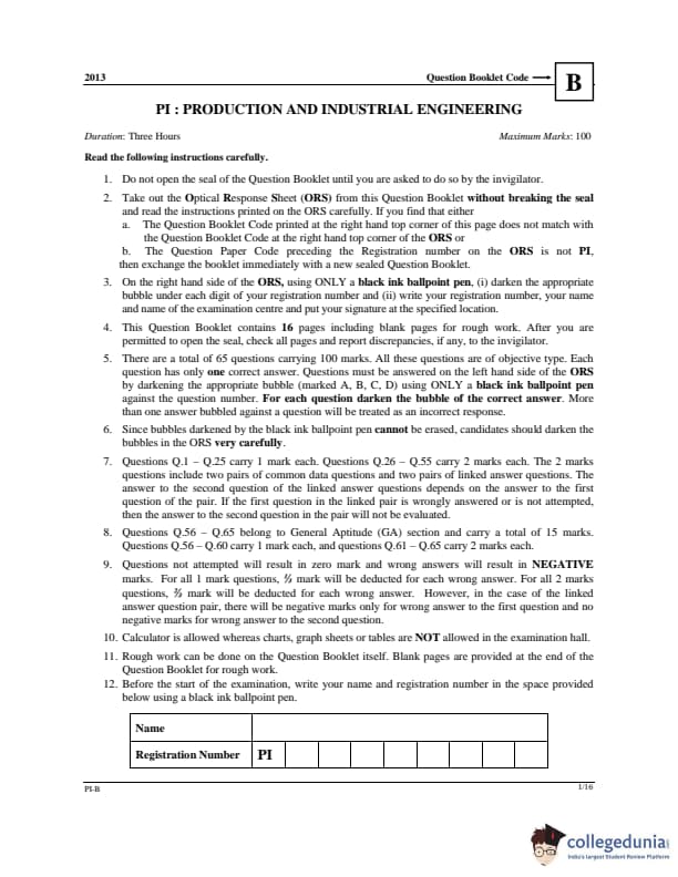 GATE 2013 Production & Industrial Engineering (PI) Question Paper is now available to download here. The exam was conducted by IIT Bombay on February 10, 2013 in the forenoon session. The question paper was divided into 2 sections, namely, General Aptitude [15 marks], and Core subjects [85 marks]. The question paper had a total of 65 questions which had a total of 100 marks with a time duration of 3 hours.