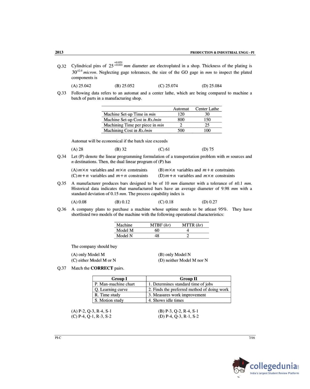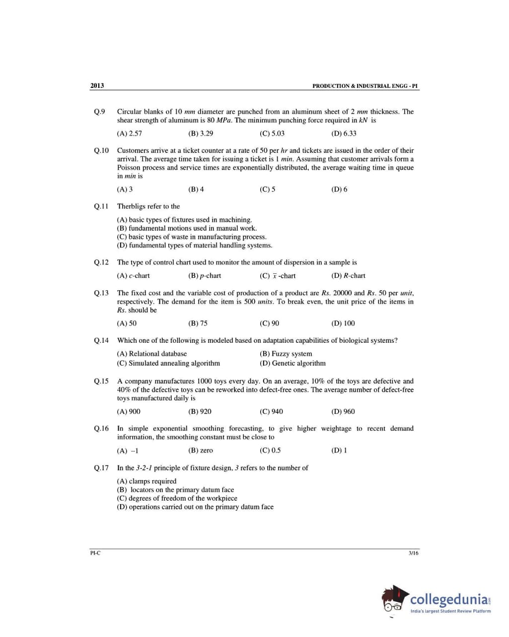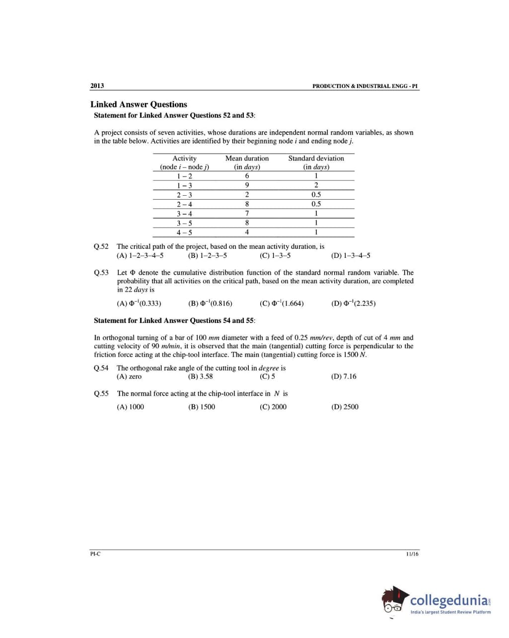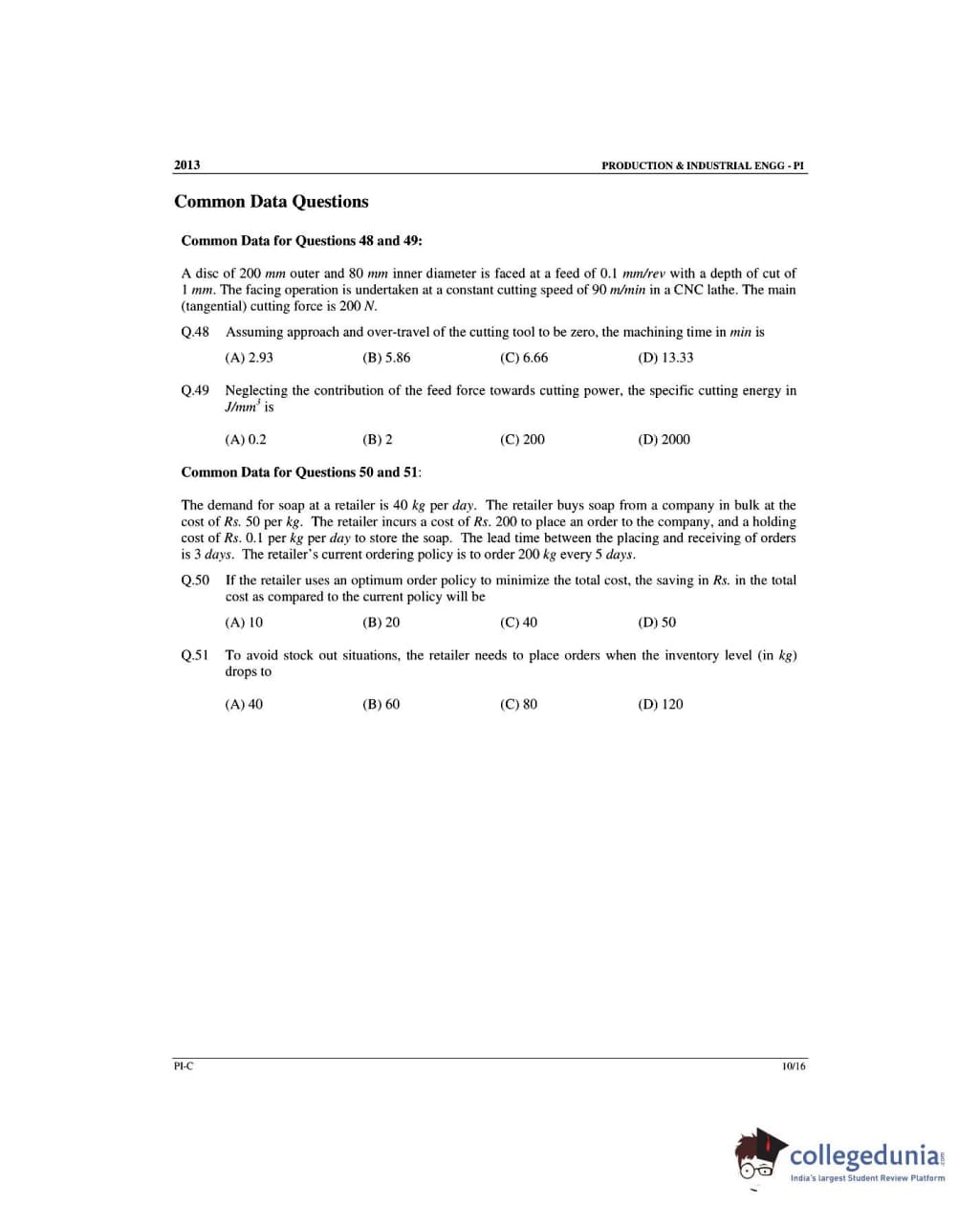 GATE 2013 Production and Industrial Engineering (PI) - Slot 3 Question Paper with Answer Key PDF -Forenoon Session