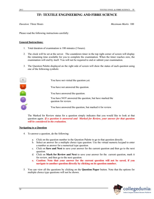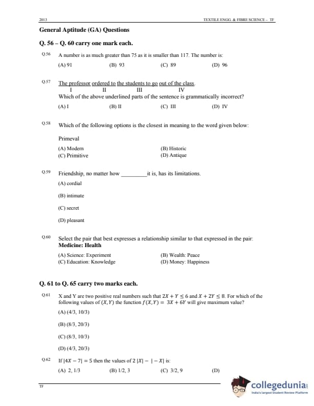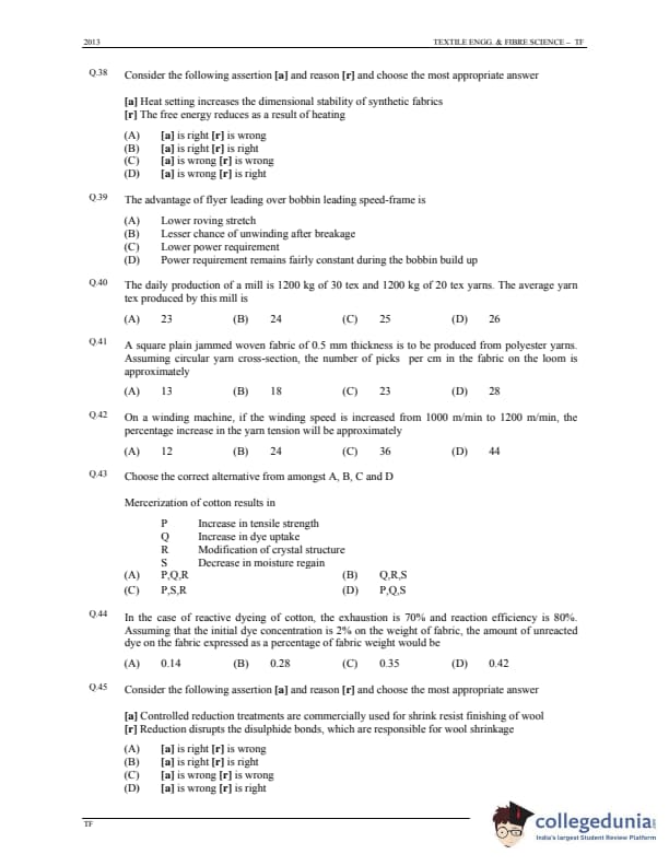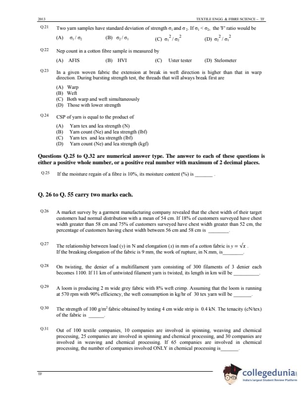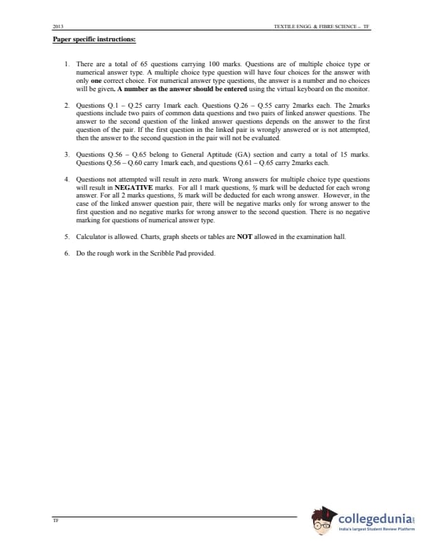 GATE 2013 Textile Engineering & Fibre Science (TF) Question Paper is now available to download here. The exam was conducted by IIT Bombay on January 20, 2013 in the forenoon session. The question paper was divided into 2 sections, namely, General Aptitude [15 marks], and Core subjects [85 marks]. There were a total of 65 questions with a blend of Multiple Choice Questions (MCQs) and Numerical Answer Type (NAT) Type questions.