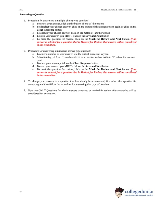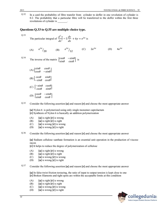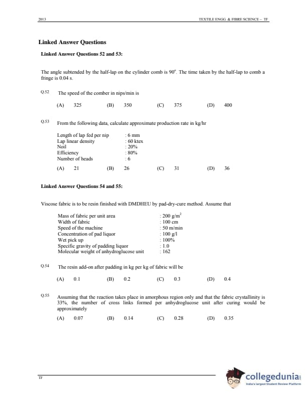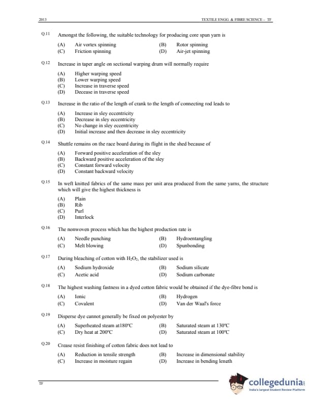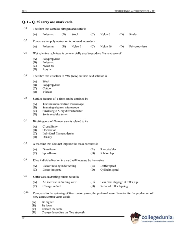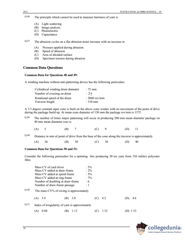 GATE 2013 Textile Engineering & Fibre Science (TF) Question Paper with Answer Key PDFs - (January 20 - Forenoon Session)