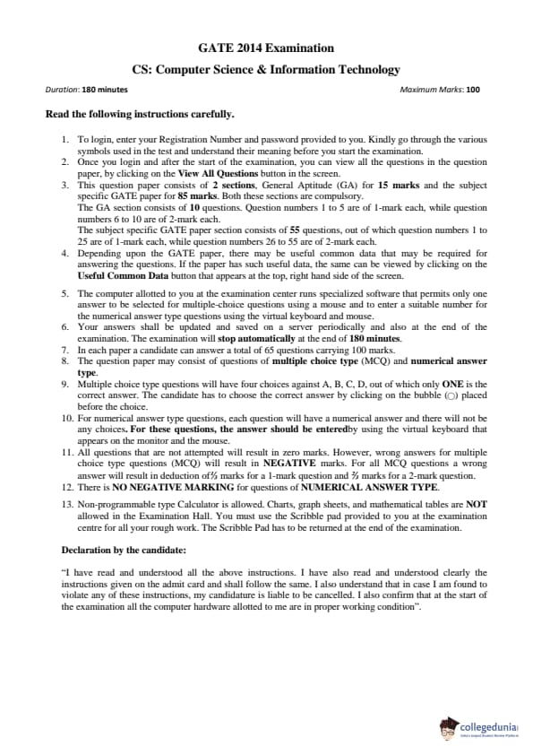 - In Multiple Choice Questions (MCQs), there was one-third negative marking for wrong answer in one mark MCQs and two-third negative marking for each wrong answer in two marks MCQs for GATE 2014 CS Question Paper