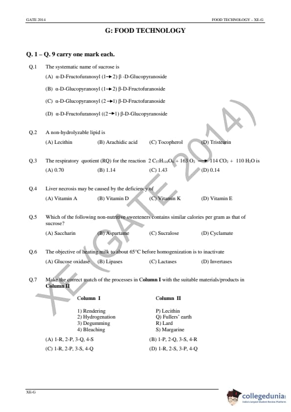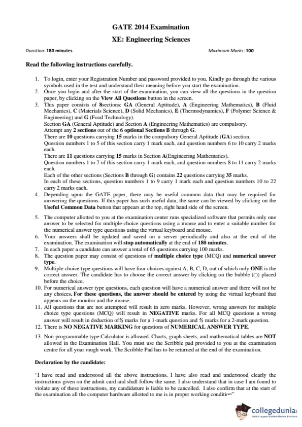 - GATE XE 2014 had questions of 1 and 2 marks, and for every incorrect answer, It was compulsory to attempt the GA, Engineering Mathematics section and any 2 sections out of 6 optional sections from B through G.The paper has more MCQ questions in comparison to NAT.