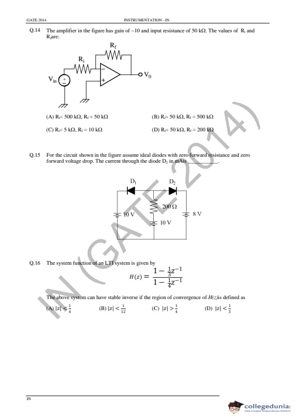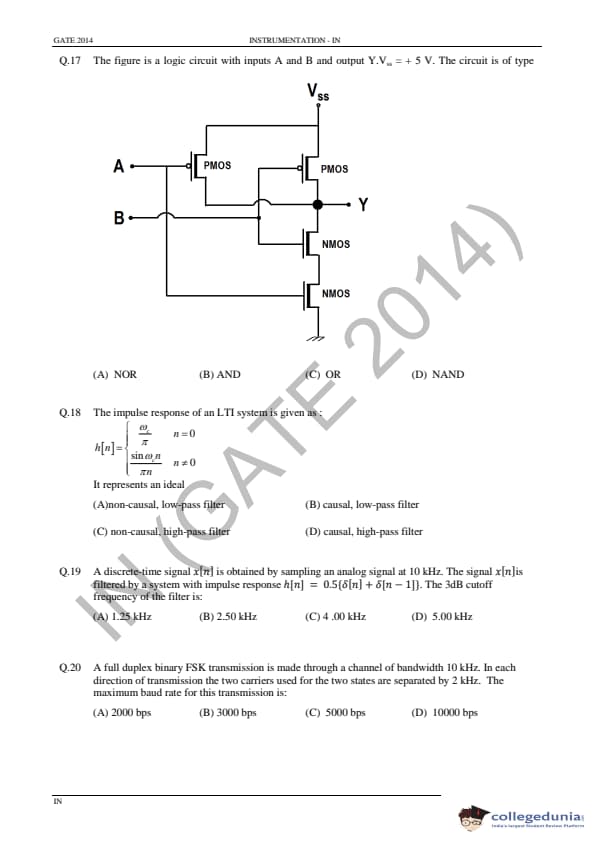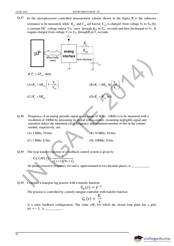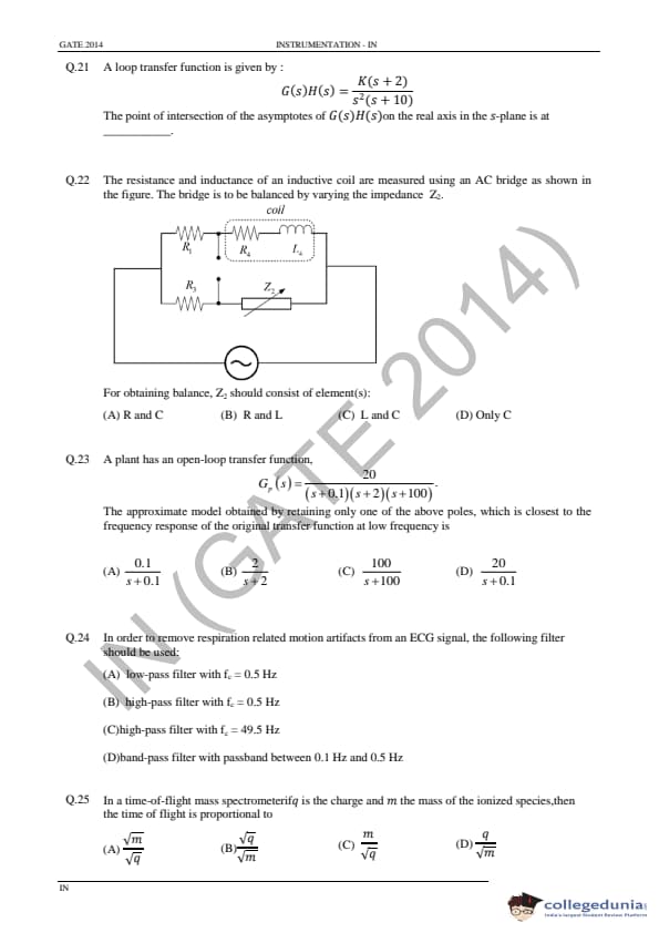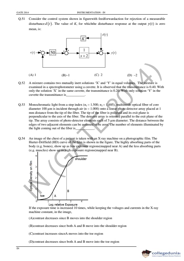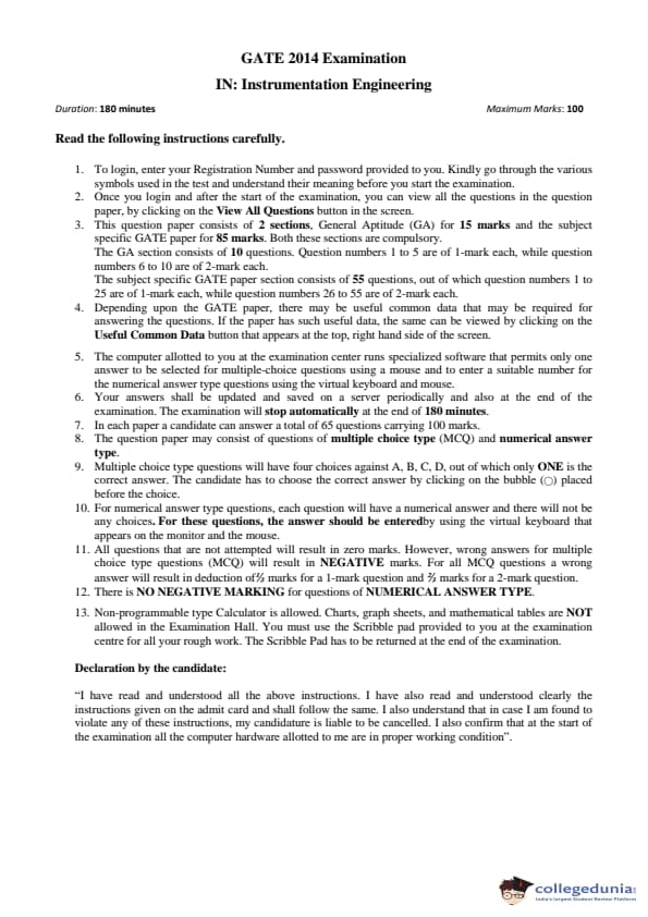 GATE 2014 IN Question Paper with Answer Key PDF is available for download. GATE 2014 IN paper was conducted on February 02 in the afternoon session (from 2.00 pm to 5.00 pm) by IIT Kharagpur. The overall difficulty level of GATE 2014 IN paper was rated moderate to tough. Questions were asked from major topics of Instrumentation Engineering like Control Systems, Digital Electronics, Analog Electronics, Optical Instrumentation, Signals, etc. There were a total of 65 questions asked GATE 2014 IN paper - 28 Numerical Answer Type questions and 37 Multiple Choice Questions. 40 questions carried one mark each and 25 questions were for two marks each.