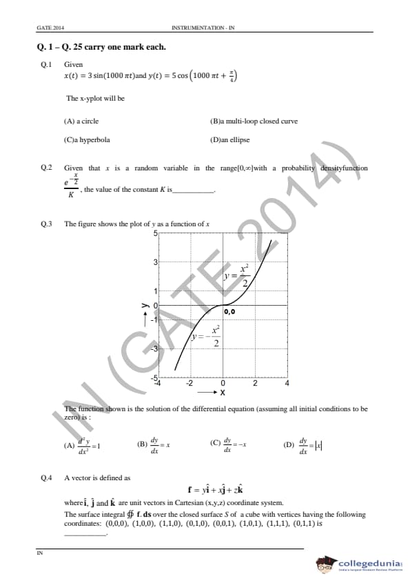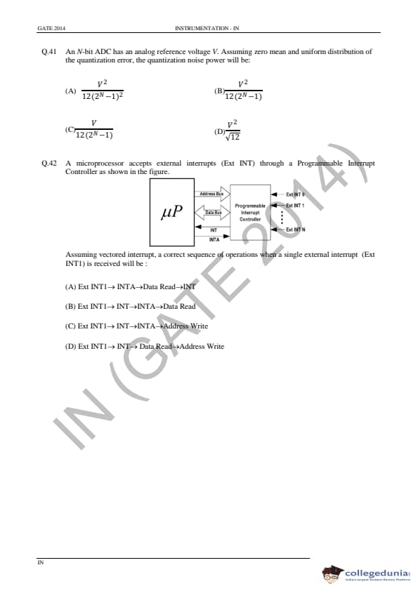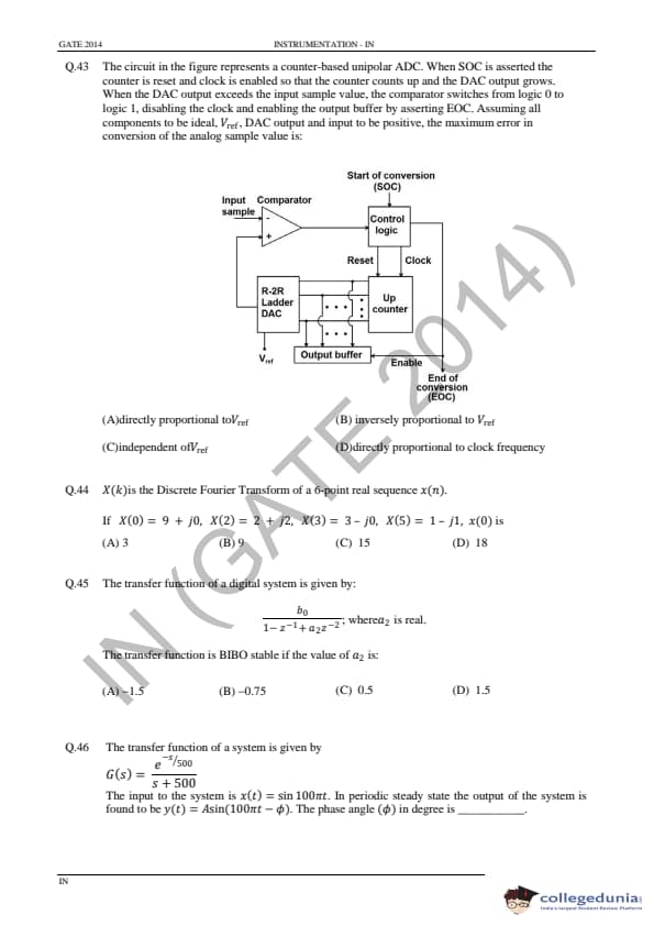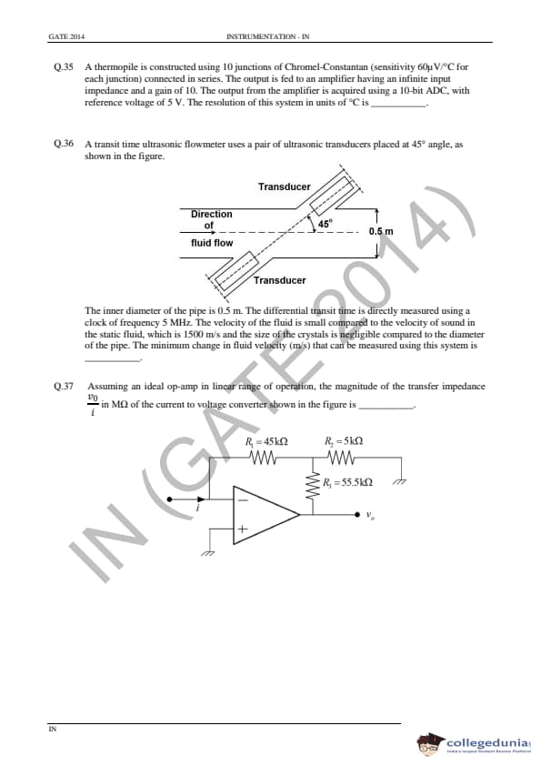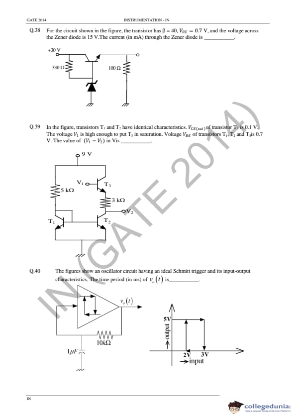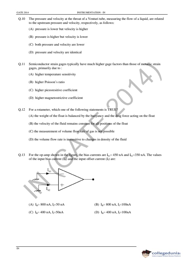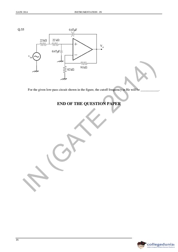 GATE 2014 IN Question Paper with Answer Key PDF is available for download. GATE 2014 IN paper was conducted on February 02 in the afternoon session (from 2.00 pm to 5.00 pm) by IIT Kharagpur. The overall difficulty level of GATE 2014 IN paper was rated moderate to tough. Questions were asked from major topics of Instrumentation Engineering like Control Systems, Digital Electronics, Analog Electronics, Optical Instrumentation, Signals, etc. There were a total of 65 questions asked GATE 2014 IN paper - 28 Numerical Answer Type questions and 37 Multiple Choice Questions. 40 questions carried one mark each and 25 questions were for two marks each.