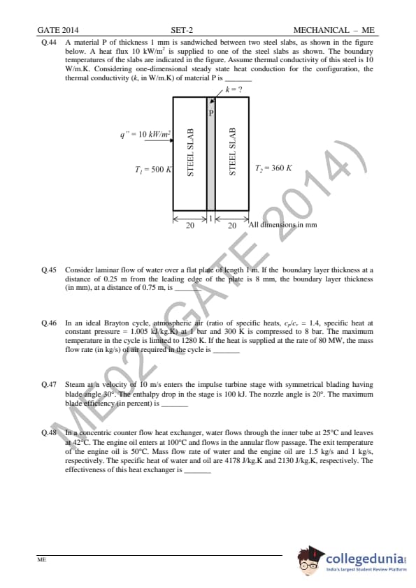 GATE 2014 ME Question Paper with Answer Key PDF Slot 2 is available for free download. GATE 2014 ME slot 2 paper was conducted by IIT Kharagpur on Feb 15 in the afternoon session from 2.00 pm to 5.00 pm. There were 27 NATs and 38 MCQs in the question paper. Numerical questions played a major role in GATE ME exam. Some questions were direct and formula-based while some of them required in-depth knowledge of the subject. Heat transfer, fluid mechanics, thermodynamics, and material strength were some of the major topics asked in GATE 2014 ME question paper.