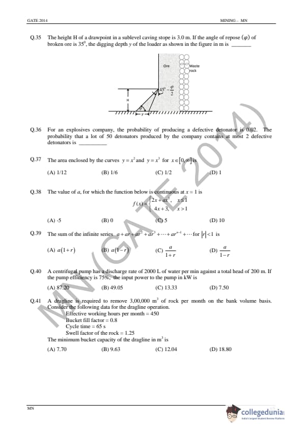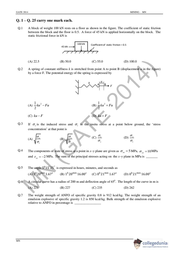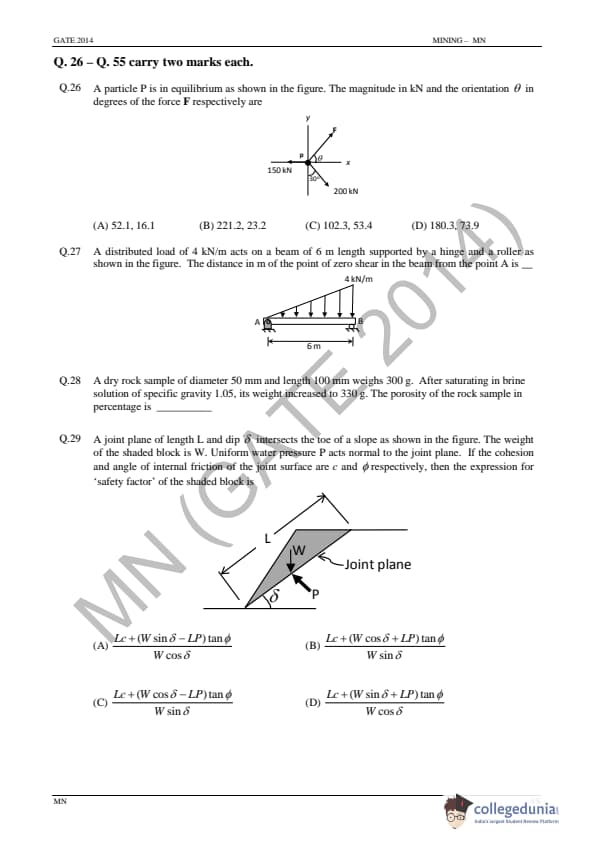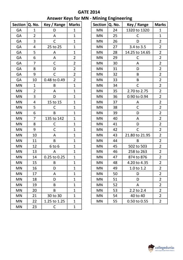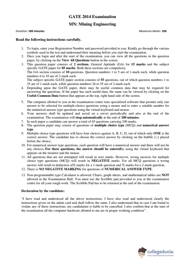 GATE 2014 MN Question Paper with answer key is available for download in the details. GATE 2014 MN exam was conducted by the Indian Institute of Technology (IIT) Kharagpur. The questions of GATE Mining Engineering (MN) 2014 were from the General Aptitude and core Mining Engineering section. The total questions in GATE 2014 MN Paper were 65 out of which the General Aptitude sections comprise 10 questions and the Mining Engineering section consisted of 55 questions and the total marks of the MN paper are 100. The overall difficulty of GATE 2014 MN paper was rated as easy to moderate.