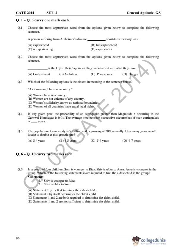 - There were questions from two sections which are General Aptitude and Mining Engineering in GATE 2014 MN paper.