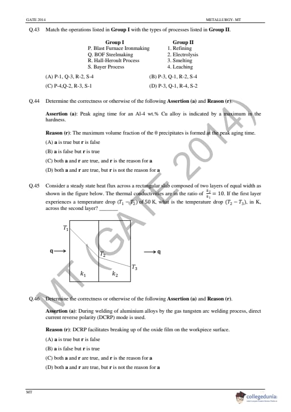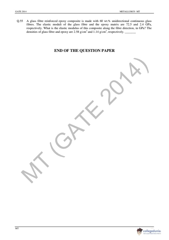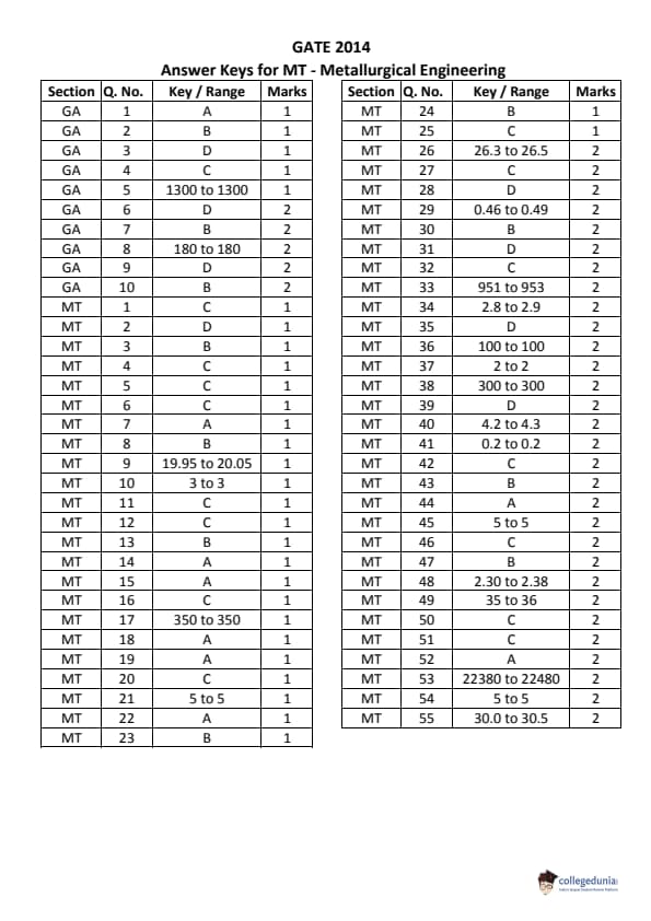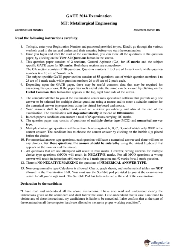 GATE 2014 MT Question Paper with answer key is available for download in the details. GATE 2014 MT exam was conducted by the Indian Institute of Technology (IIT) Kharagpur on February 2 (Forenoon session). The total questions in GATE 2014 MT Paper were 65 out of which the General Aptitude sections comprise 10 questions and the Metallurgical Engineering section consisted of 55 questions and the total marks of the MT paper were 100. The overall difficulty of the GATE 2014 MT paper was rated as moderate by the students who appeared for the examination.