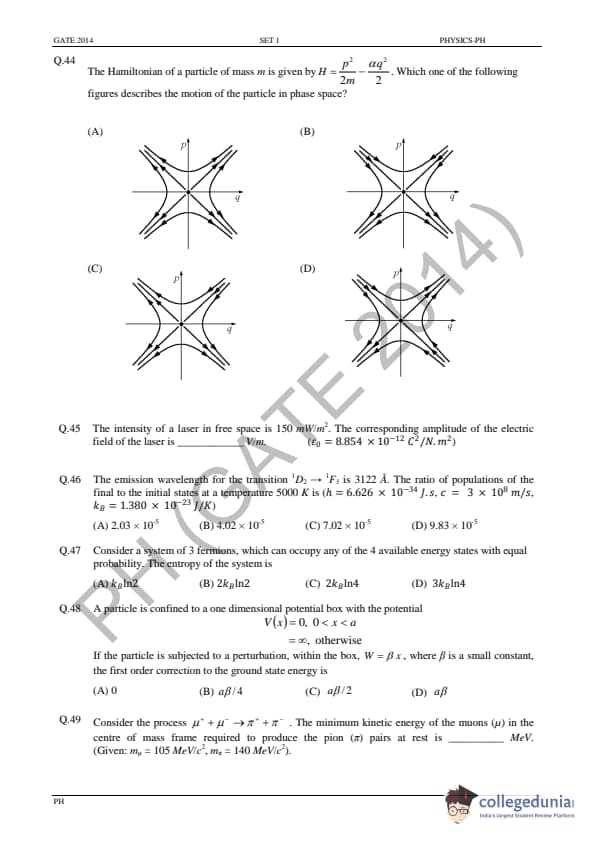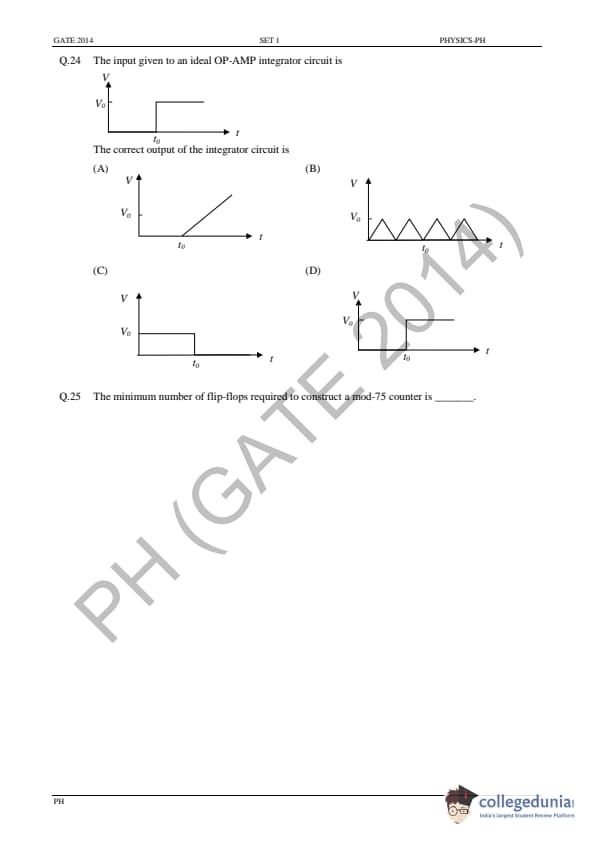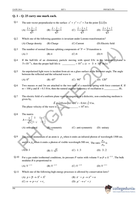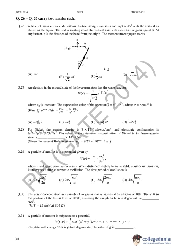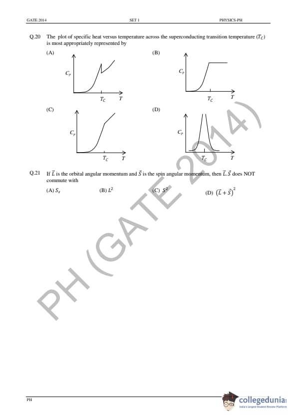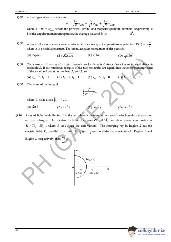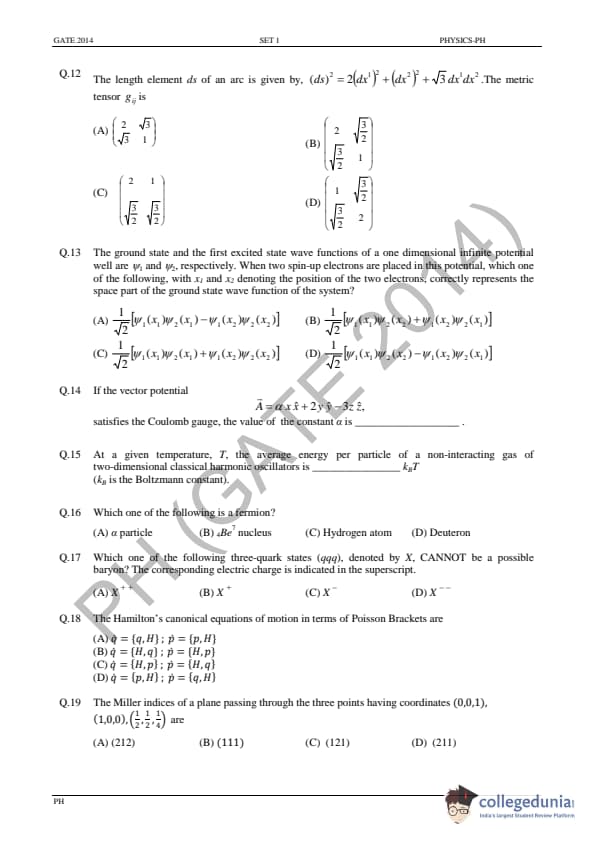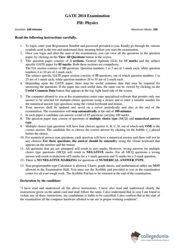 GATE 2014 PH Question Paper with answer key is available for download in the details. GATE 2014 PH exam was conducted by the Indian Institute of Technology (IIT) Kharagpur. The total number of questions in GATE 2014 PH Paper was 65 out of which the General Aptitude sections comprise 10 questions and the Physics section consisted of 55 questions. The overall difficulty of GATE 2014 PH paper was rated by the students as moderate.