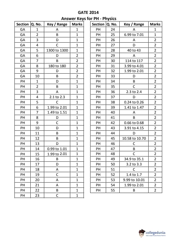 GATE 2014 PH Answer Key Details