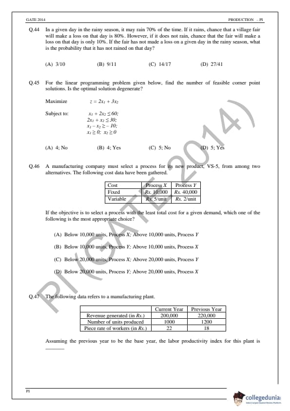 GATE 2014 Production and Industrial Engineering (PI) Question Paper and Answer Key PDFs are available for download.GATE 2014 Production and Industrial Engineering (PI) was conducted by the Indian Institute of Technology, Kharagpur on February 2, 2014 in the afternoon session. The paper has 65 questions, and the total duration of the exam was 180 minutes. GATE 2014 PI had a total of 2 sections, the General Aptitude Section had 10 questions whereas the subject-specific section had 55 questions to attempt. The question paper of GATE PI 2014 consisted of Multiple Type Questions(MCQ) and Numerical Answer Type (NAT) Questions