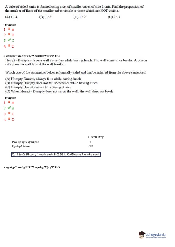 GATE 2015 CY paper consisted of two types of questions i.e MCQs (Multiple Choice Question) and NAT (Numerical Multiple Type). The paper was for a total of 100 marks. MCQ questions had a higher weightage thus contributing to maximum questions in GATE 2015 CY exam.