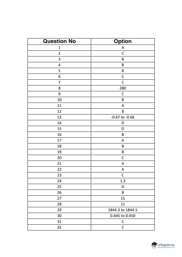 | Question No. | Answer | Question No. | Answer |