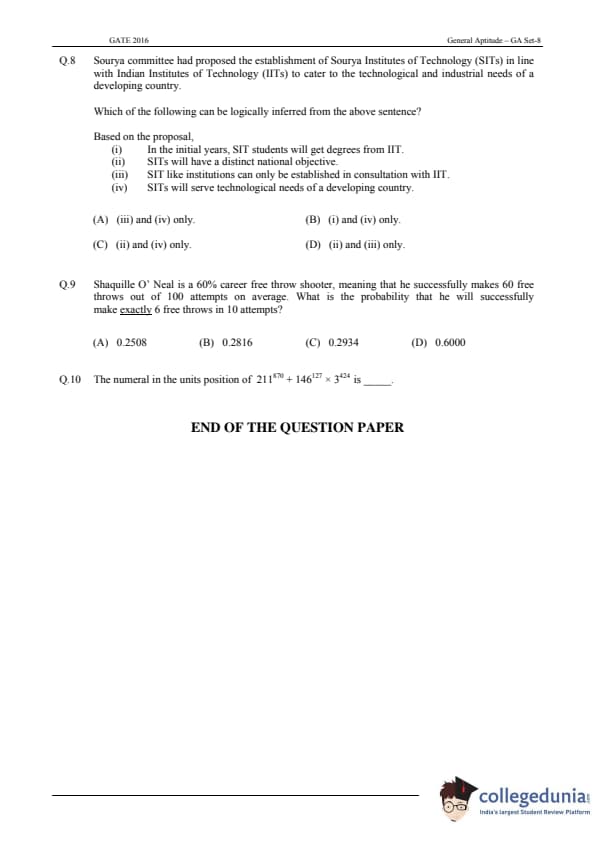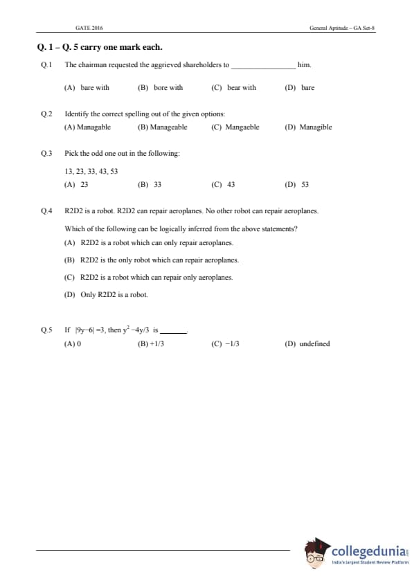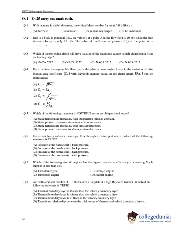GATE 2016 AE Question Paper had a total number of 65 questions, in which general aptitude had 10 questions and the rest of the 55 questions were from core subjects.