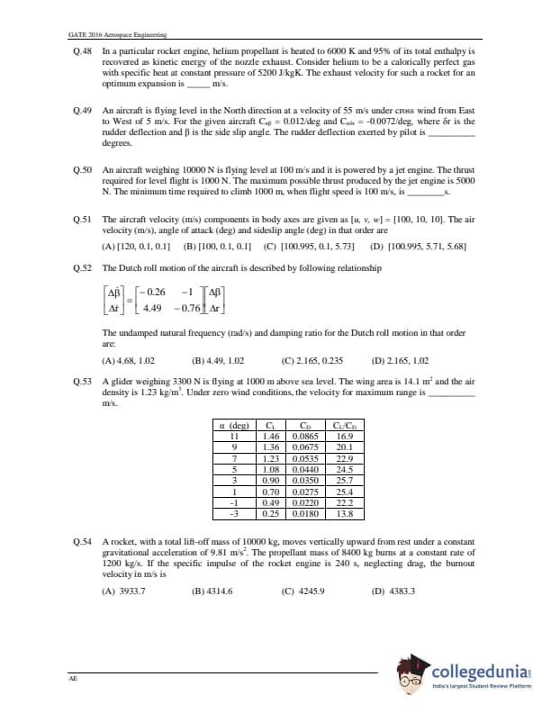 GATE 2016 Aerospace Engineering (AE) Question Paper with Answer Key PDFs is available here. GATE 2016 Aerospace Engineering exam was conducted by IISc Bangalore on February 7, 2016 in the afternoon session. There were a total of 24 NATs and 41 MCQs. There were 30 one-mark questions and 35 two-marks questions. Major topics covered in the Aerospace Engineering exam were Aerodynamics, Flight Mechanics, Space Mechanics, and Propulsion. NATs consisted of 43 marks out of 100.