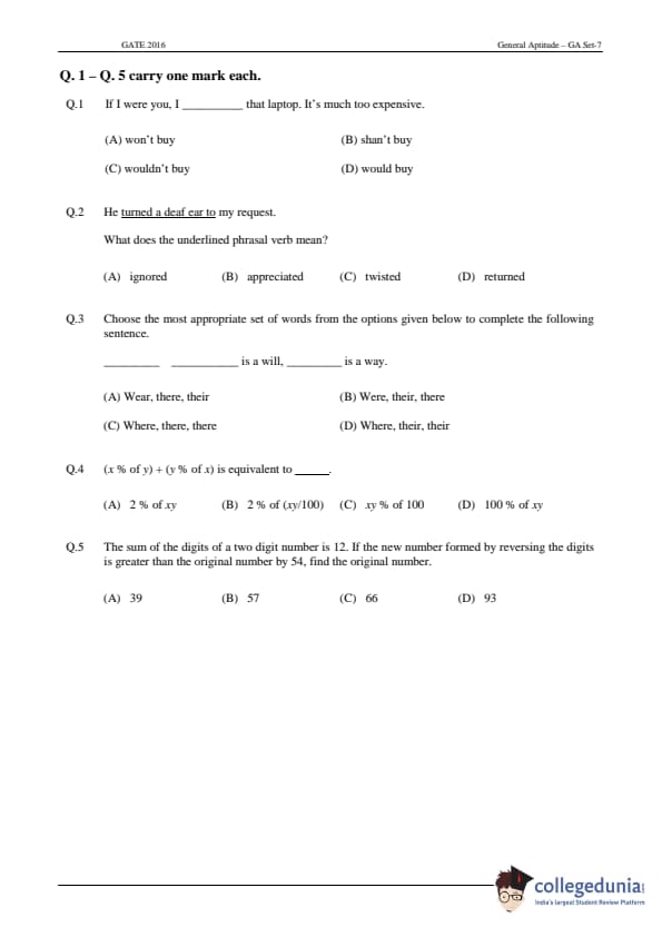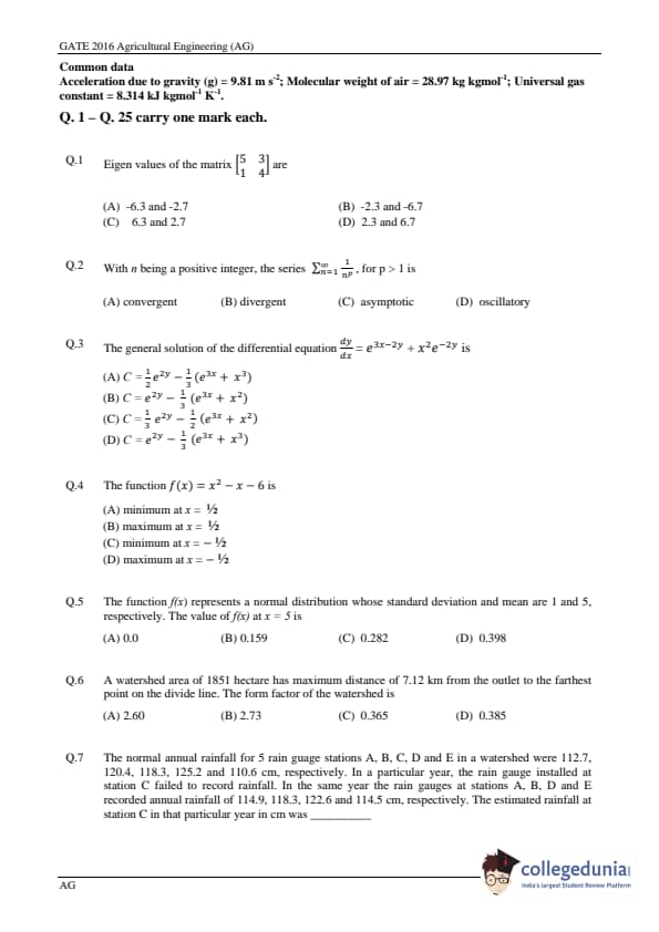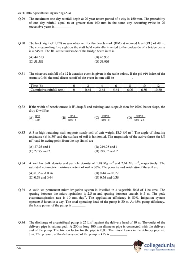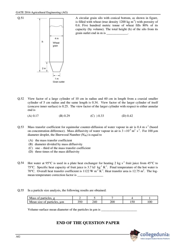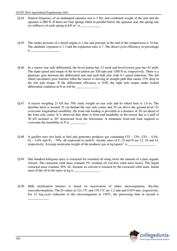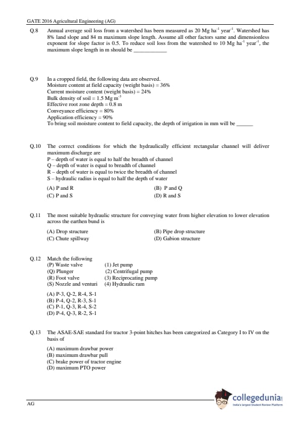 GATE 2016 Agriculture Engineering (AG) Question Paper and Answer Key PDFs are now available to download. GATE 2016 Agriculture Engineering Paper was conducted by IISC, Bangalore on February 7, 2016. GATE Question Paper consisted of a total of 65 Questions out of which General Aptitude Section comprised of 10 Questions and Agriculture Engineering section consisted of 55 questions. The overall difficulty level of GATE 2016 Agriculture Engineering Question Paper was rated moderate.