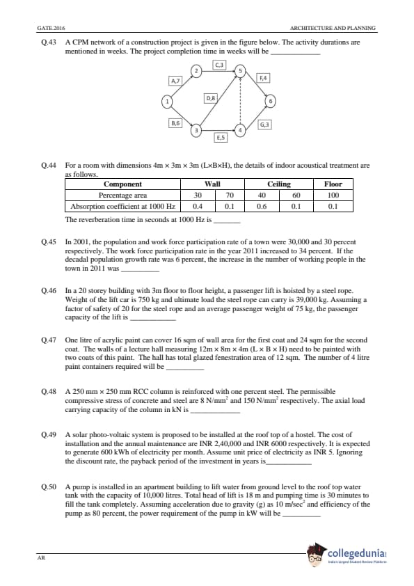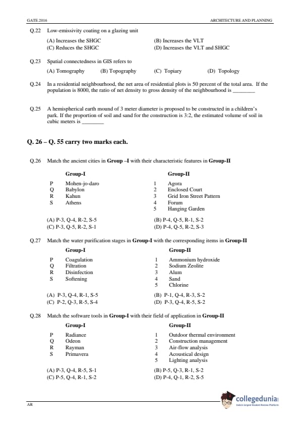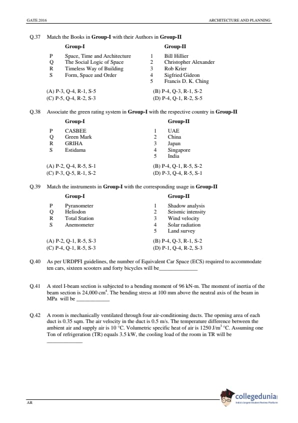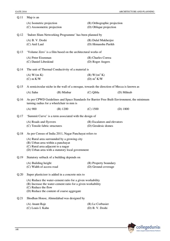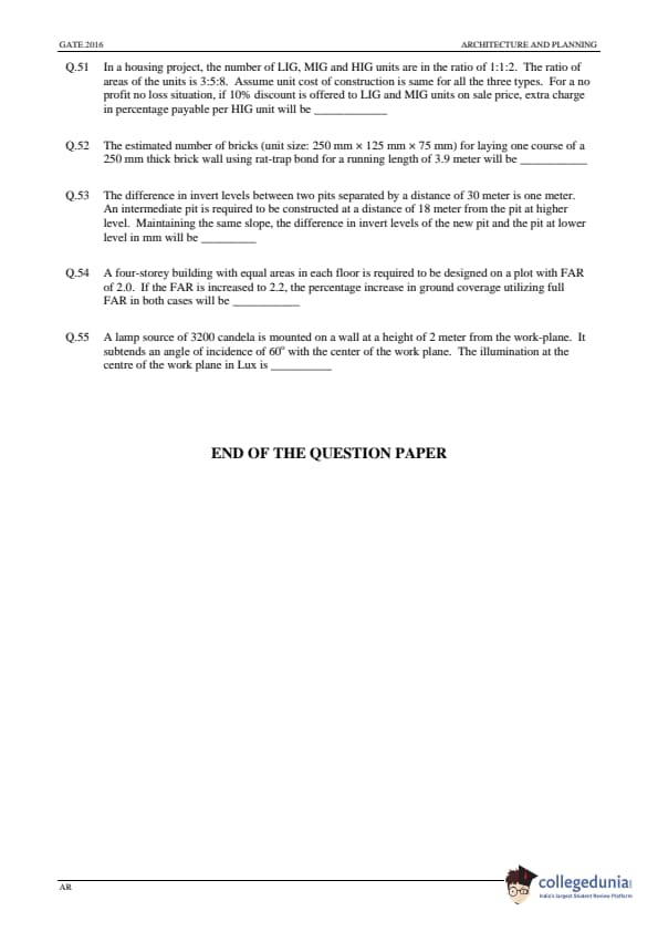 GATE 2016 Architecture and Planning (AR) Question Papers with Answer Key PDFs (January 31-Afternoon Session)