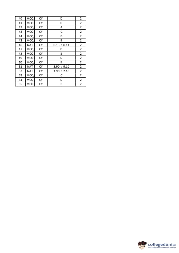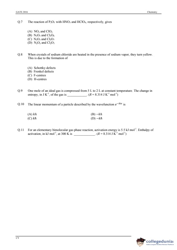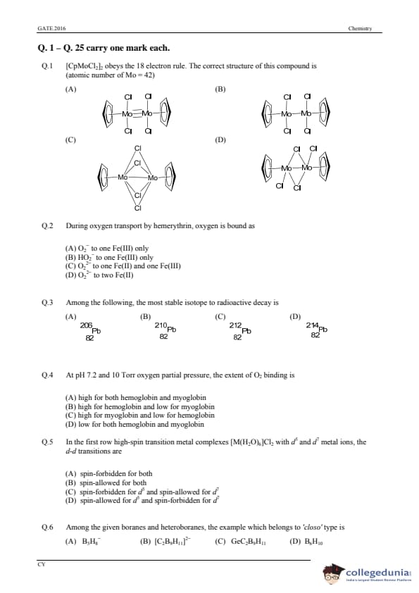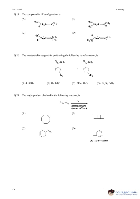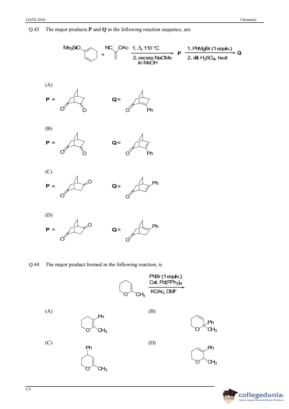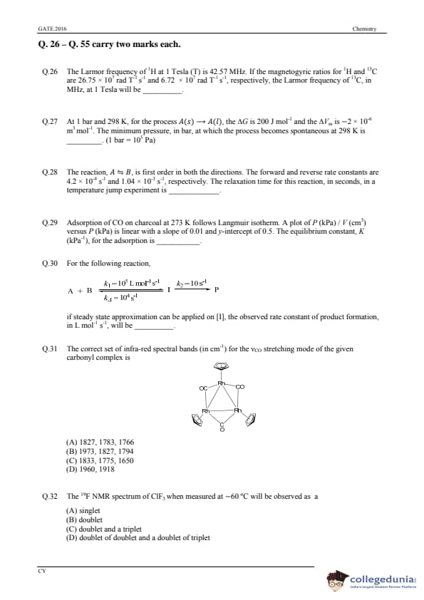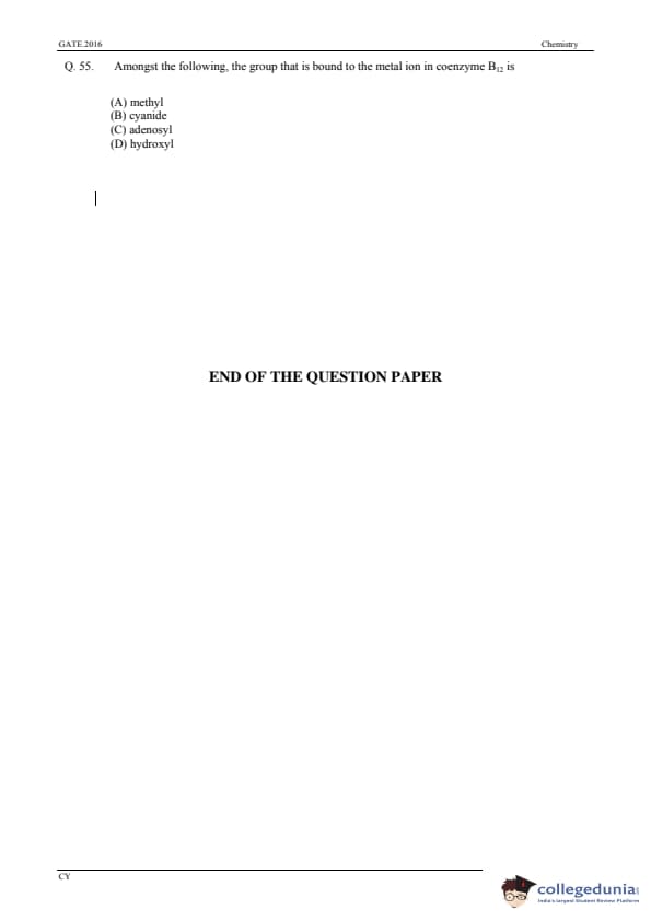 GATE 2016 Chemistry (CY) Question Paper and Answer Key PDFs are now available to download. GATE 2016 Chemistry (CY) was conducted on 31st January, 2016 in the Afternoon Session by IISC Bangalore. The overall difficulty level of the test was described as moderate. GATE Question Paper consisted of 65 questions, with 55 Numerical Answer Type Questions and 10 MCQs.