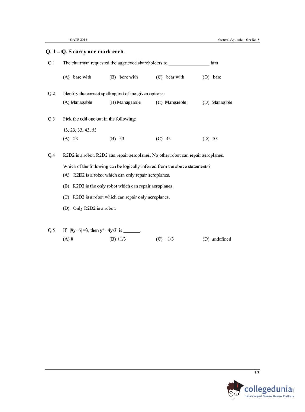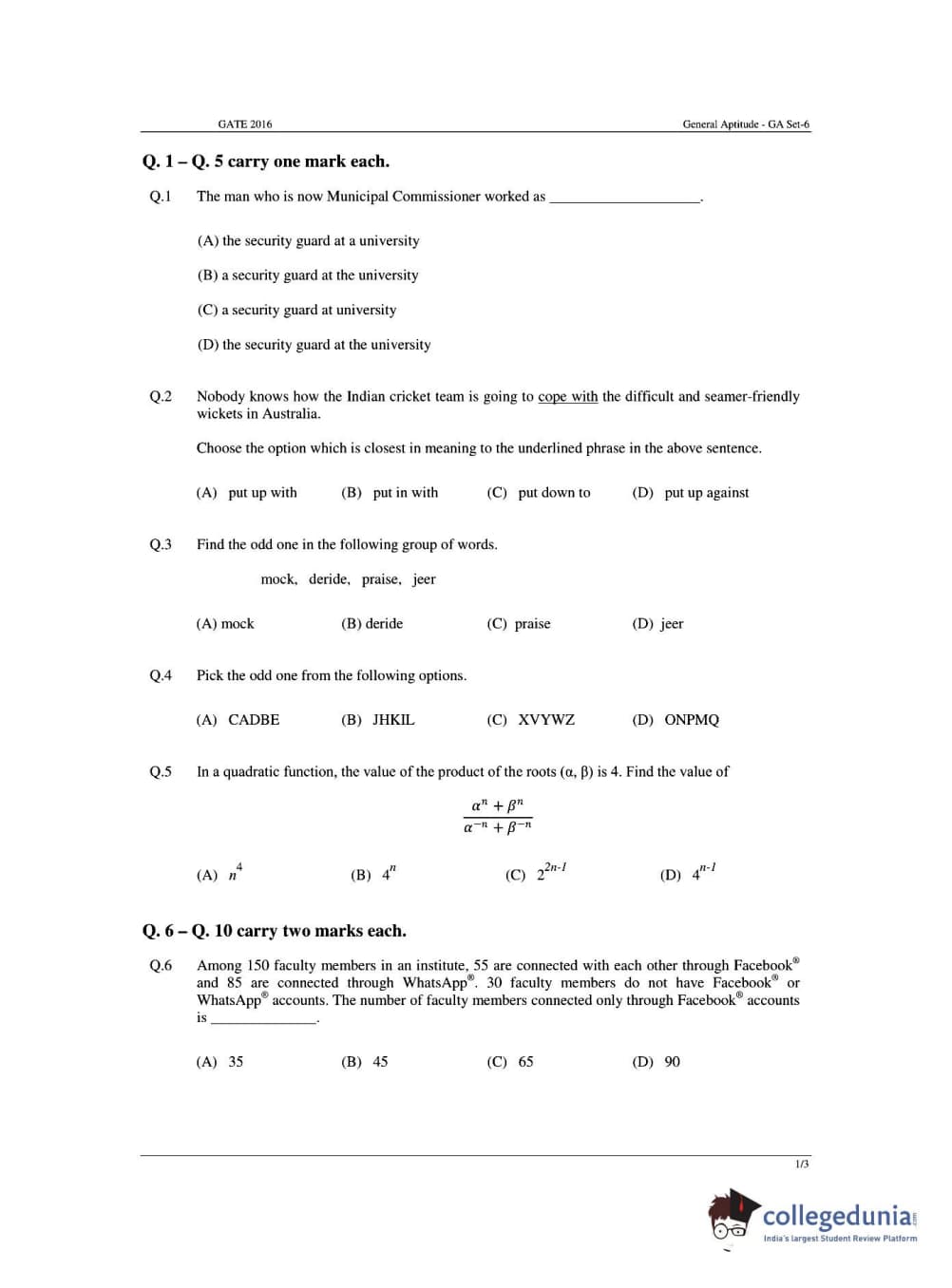 - 1/3rd and 2/3rd marks are to be deducted for every wrong answer to questions carrying 1 and 2 marks respectively.