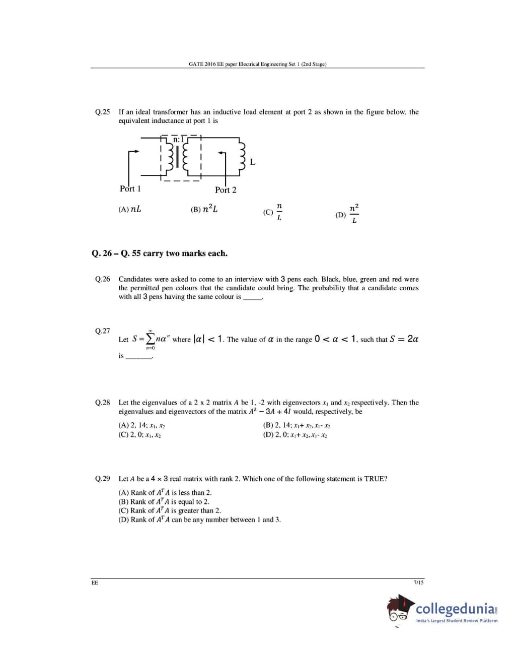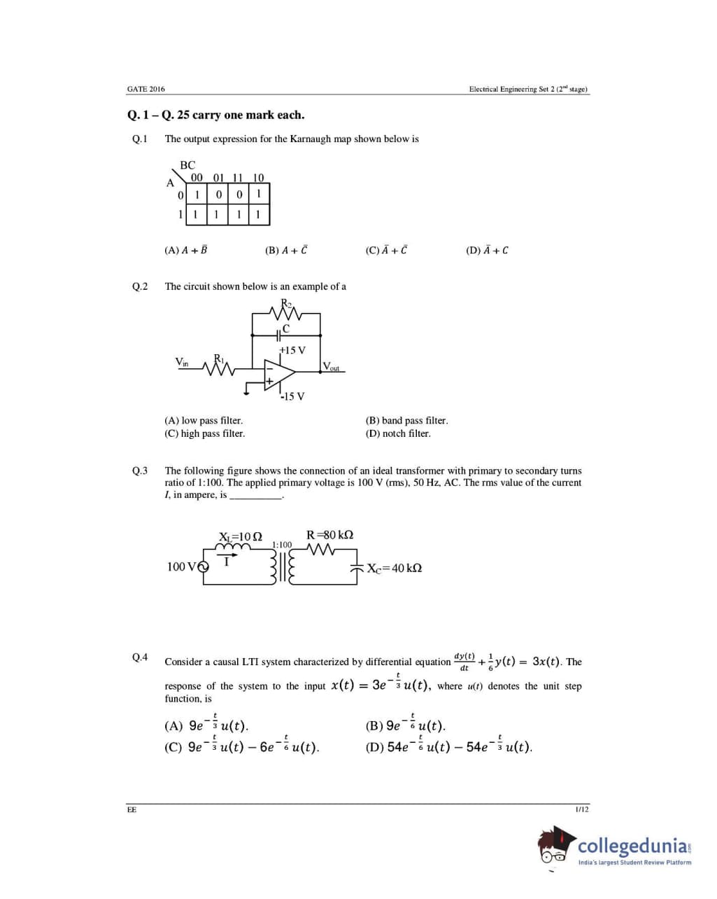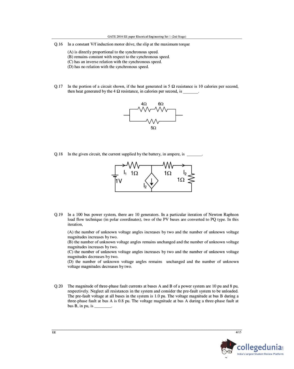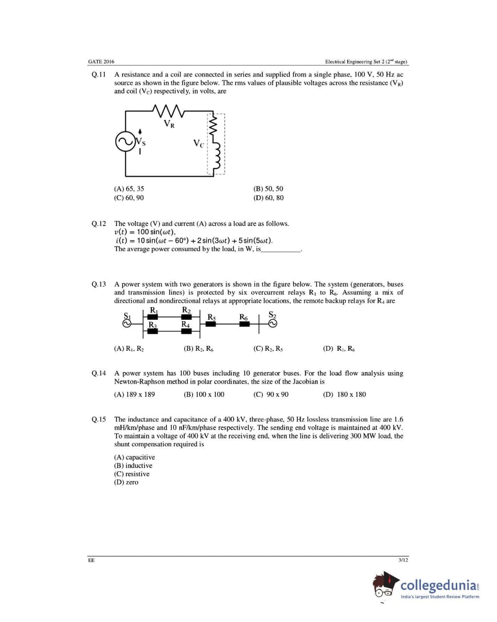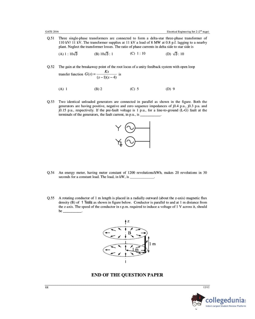 GATE 2016 Electrical Engineering (EE) question paper carries a total of 65 questions.