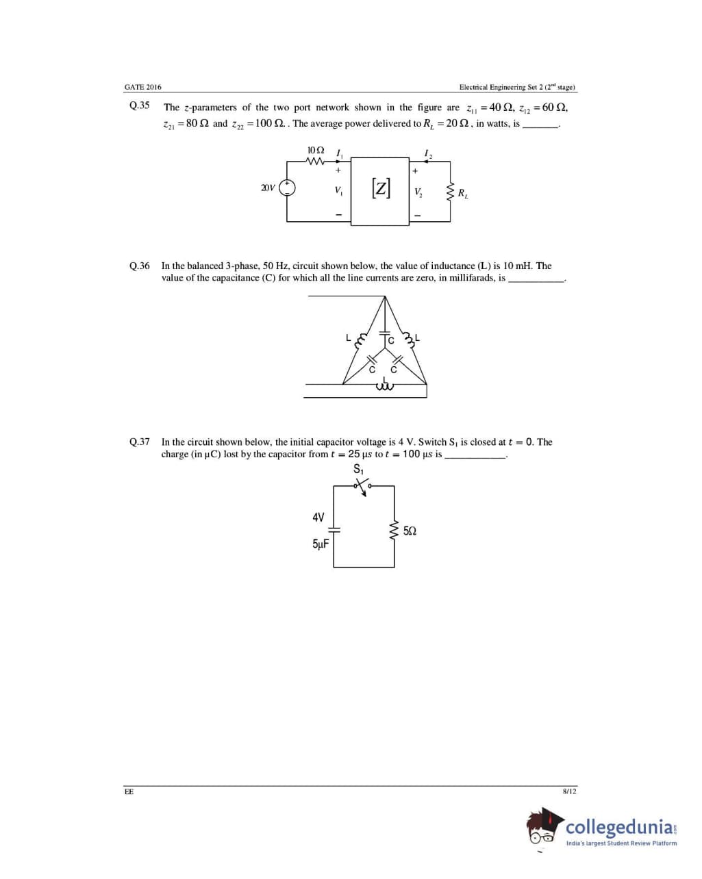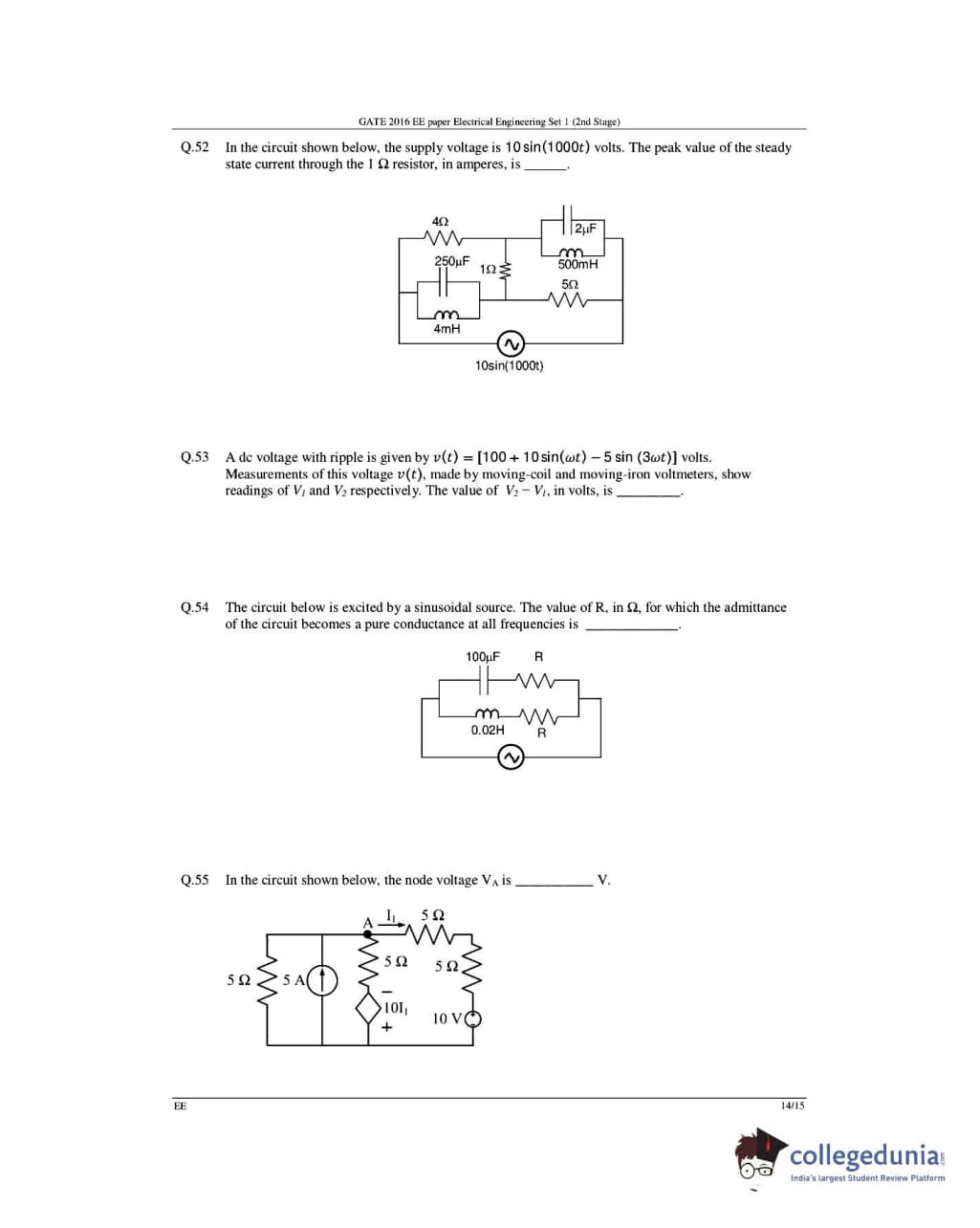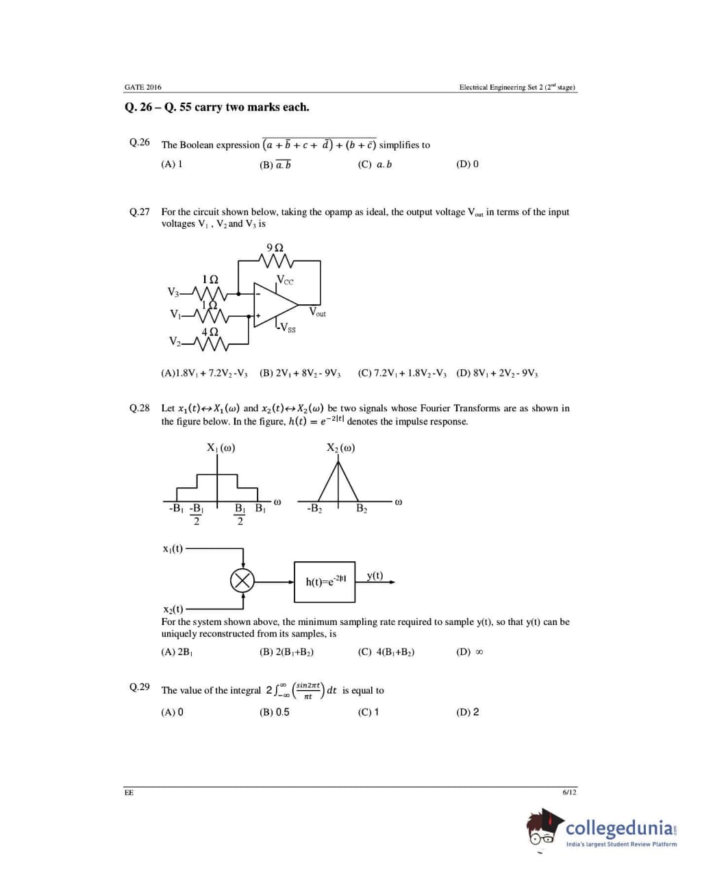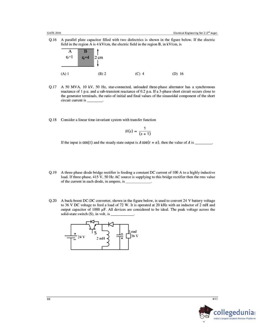 GATE 2016 Electrical Engineering (EE) Question Papers with Answer Key Pdfs- Slot 1 (February 6-Afternoon Session)