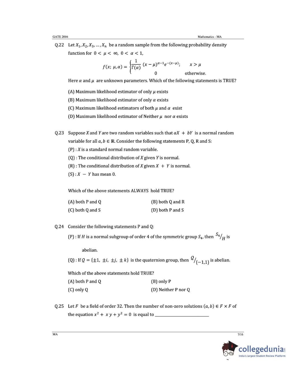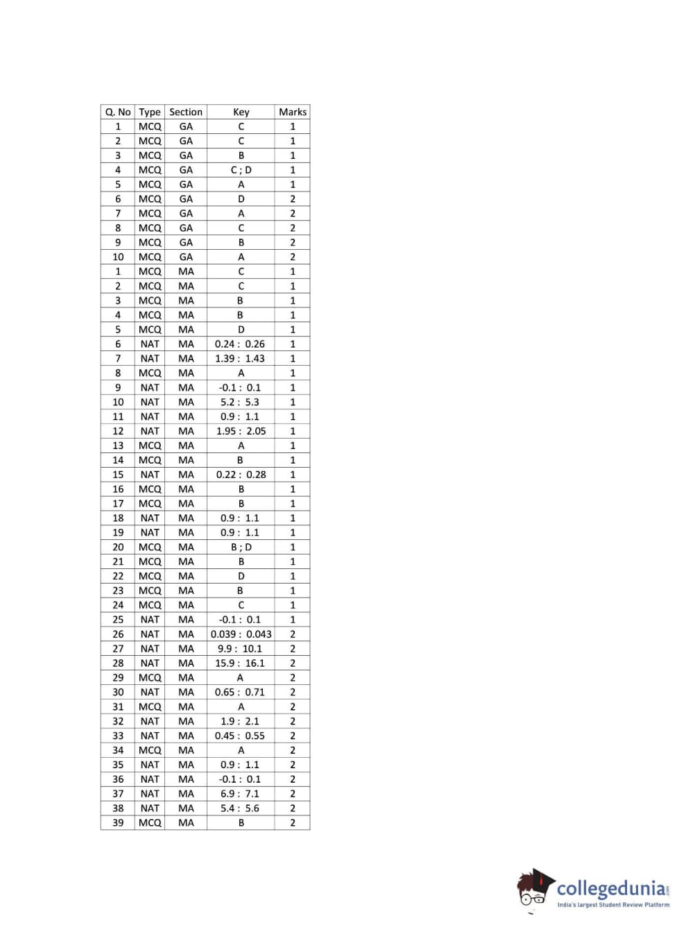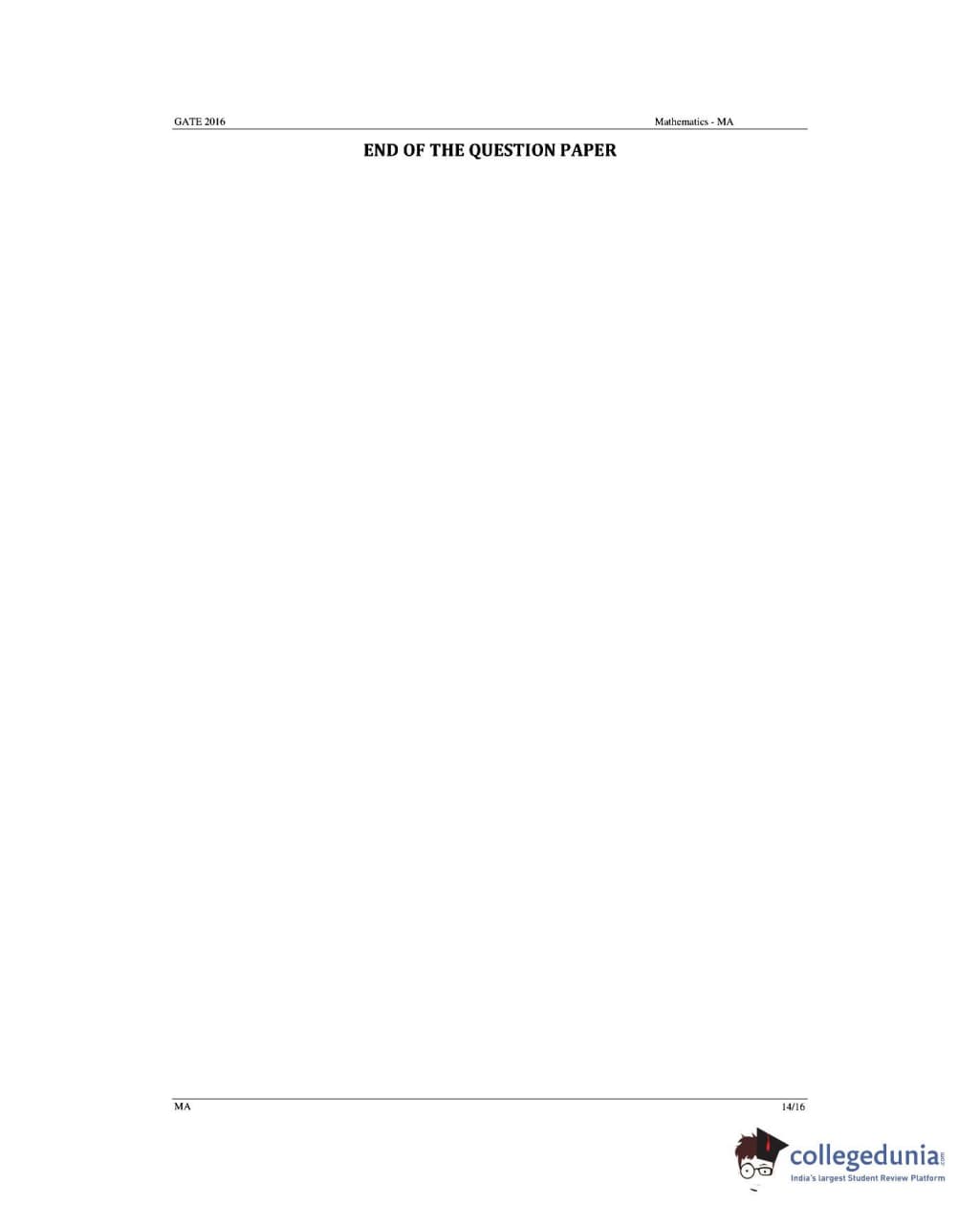 GATE 2016 MA Answer Key Details