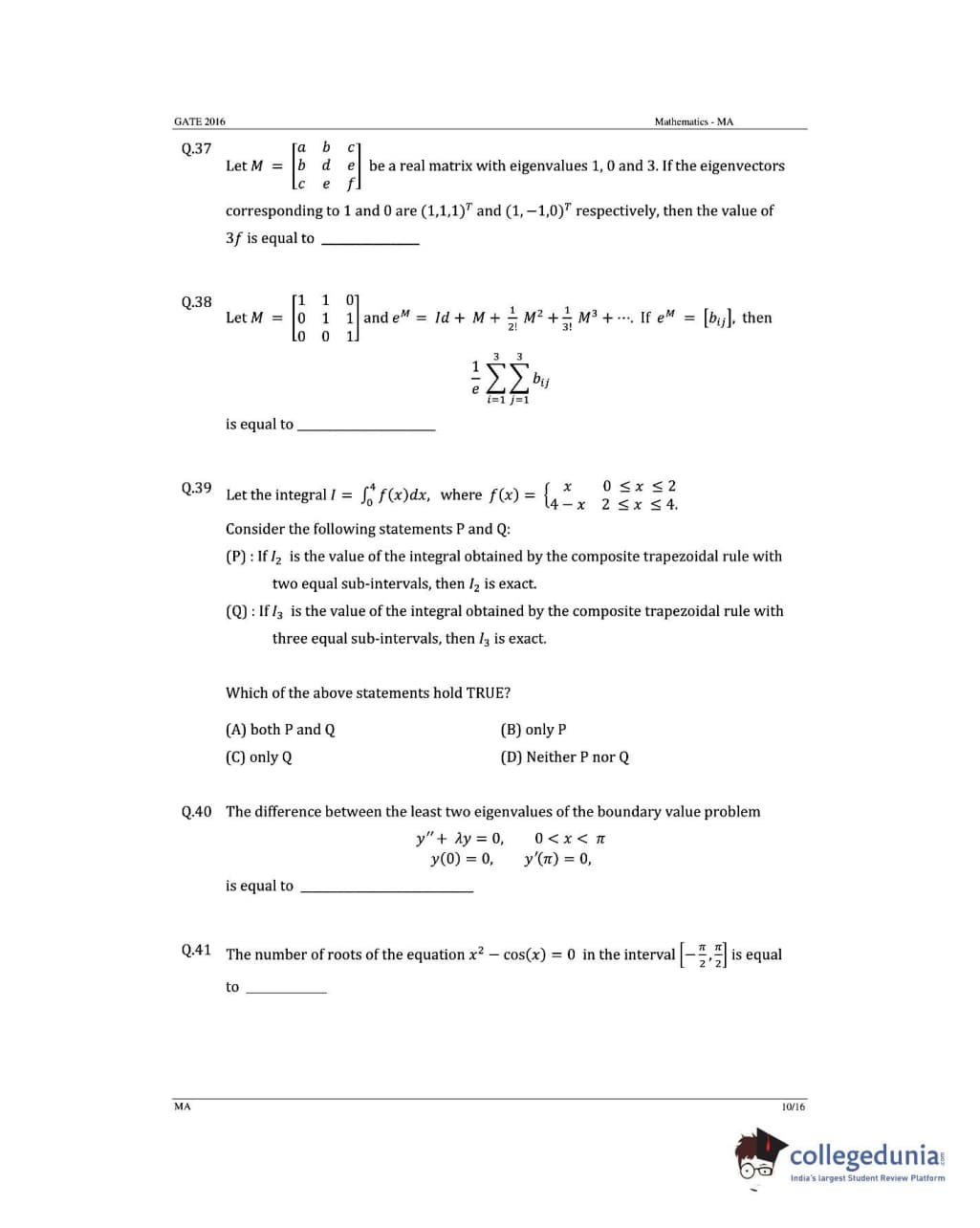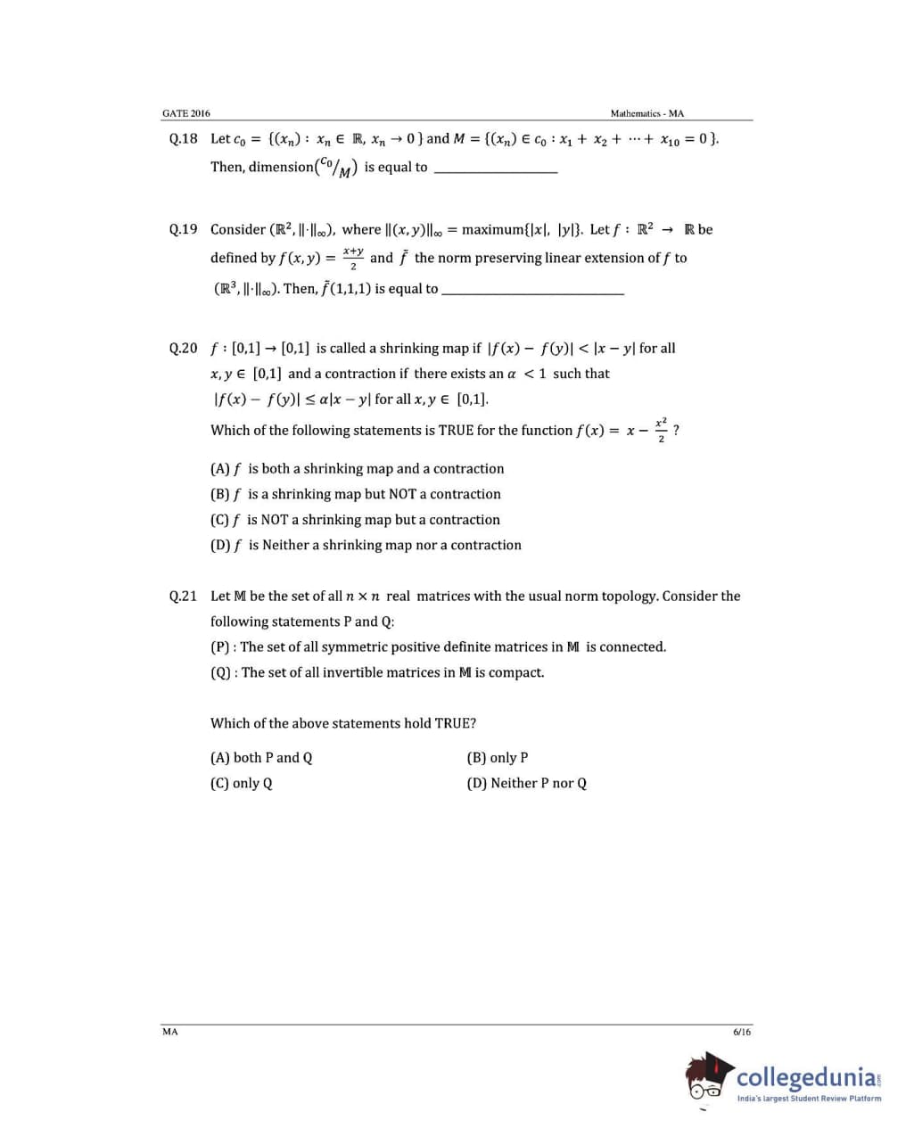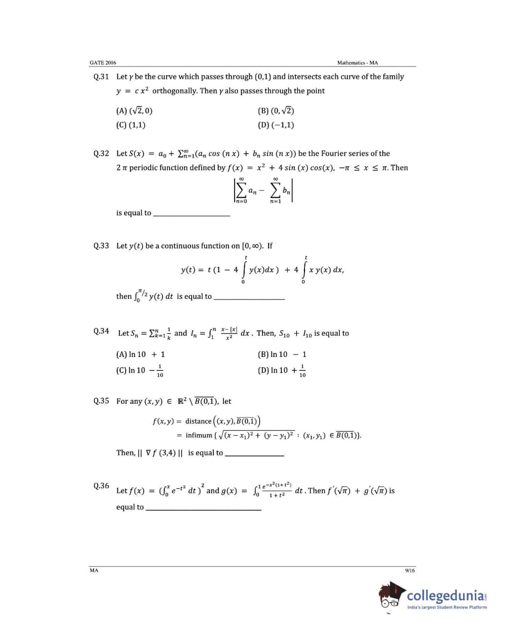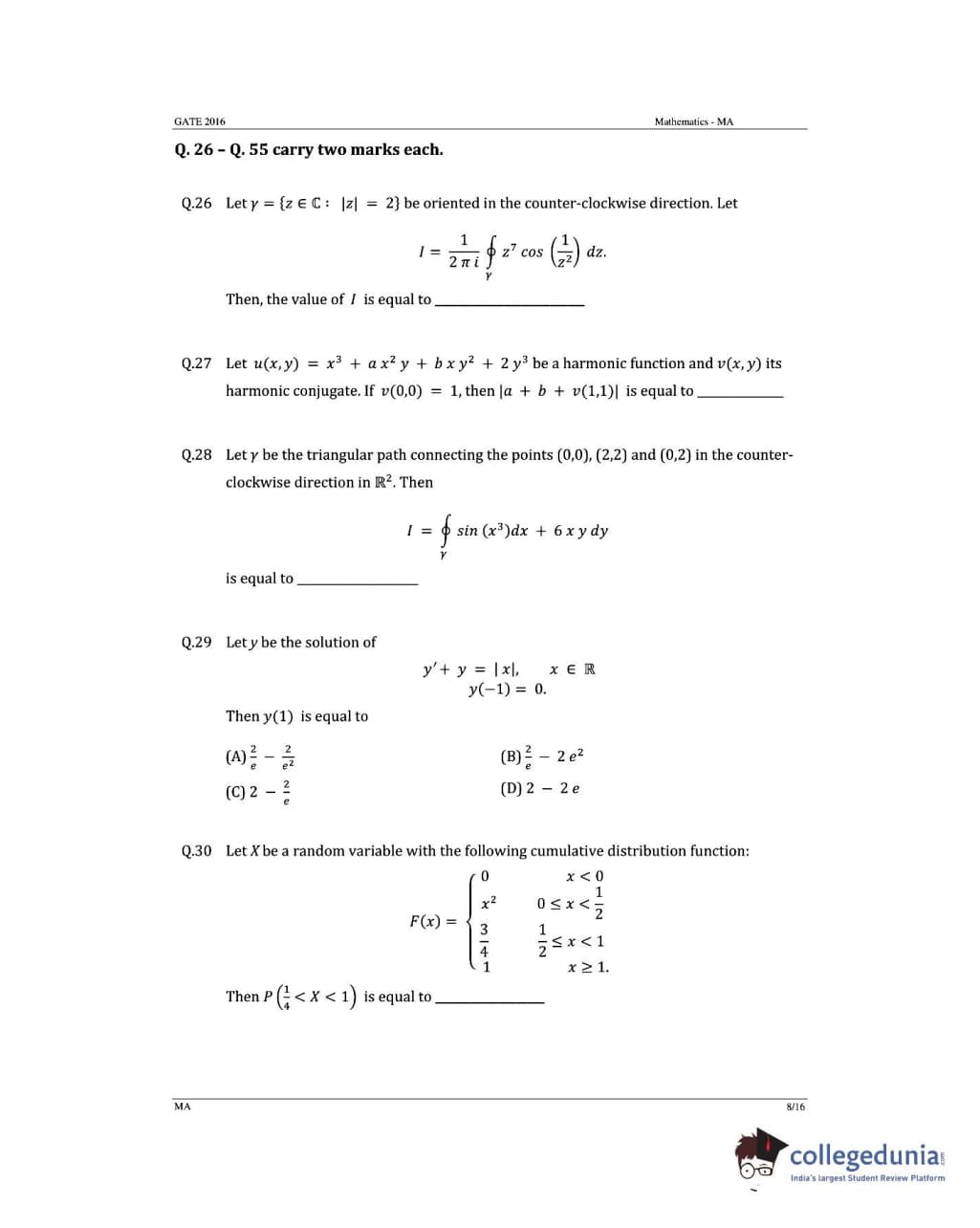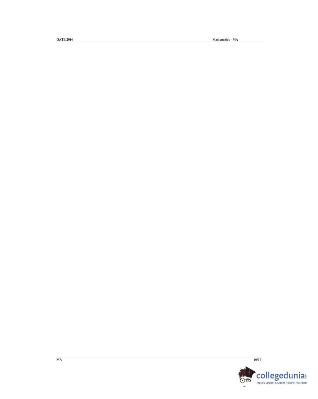 GATE 2016 Mathematics (MA) Question Paper with Answer Key PDFs (January 31- Afternoon Session)