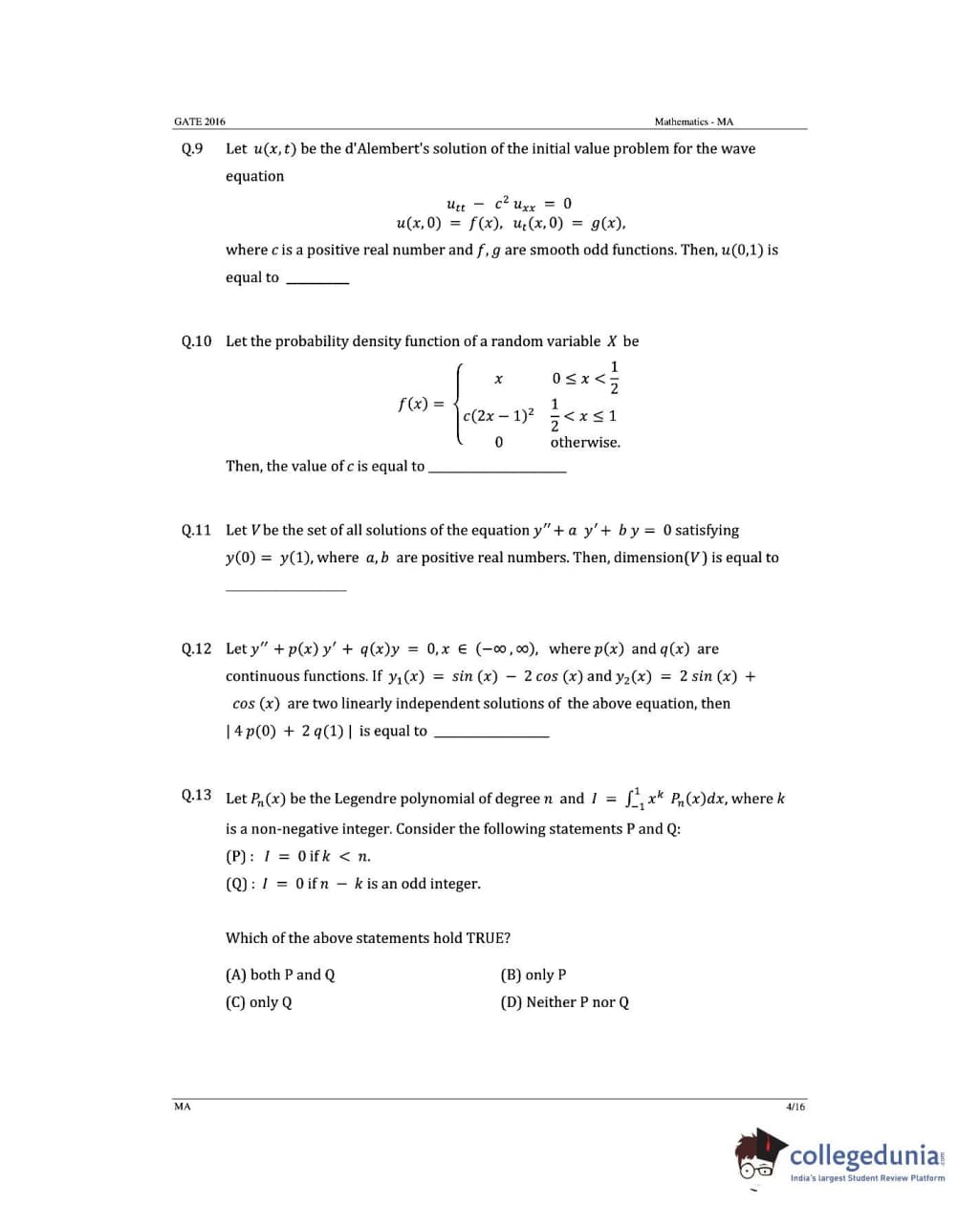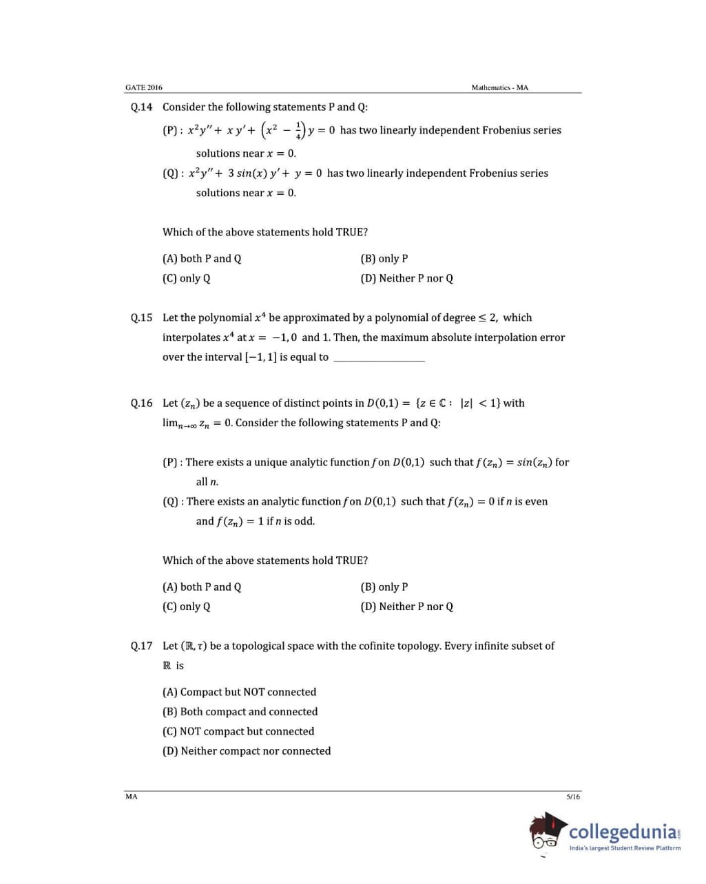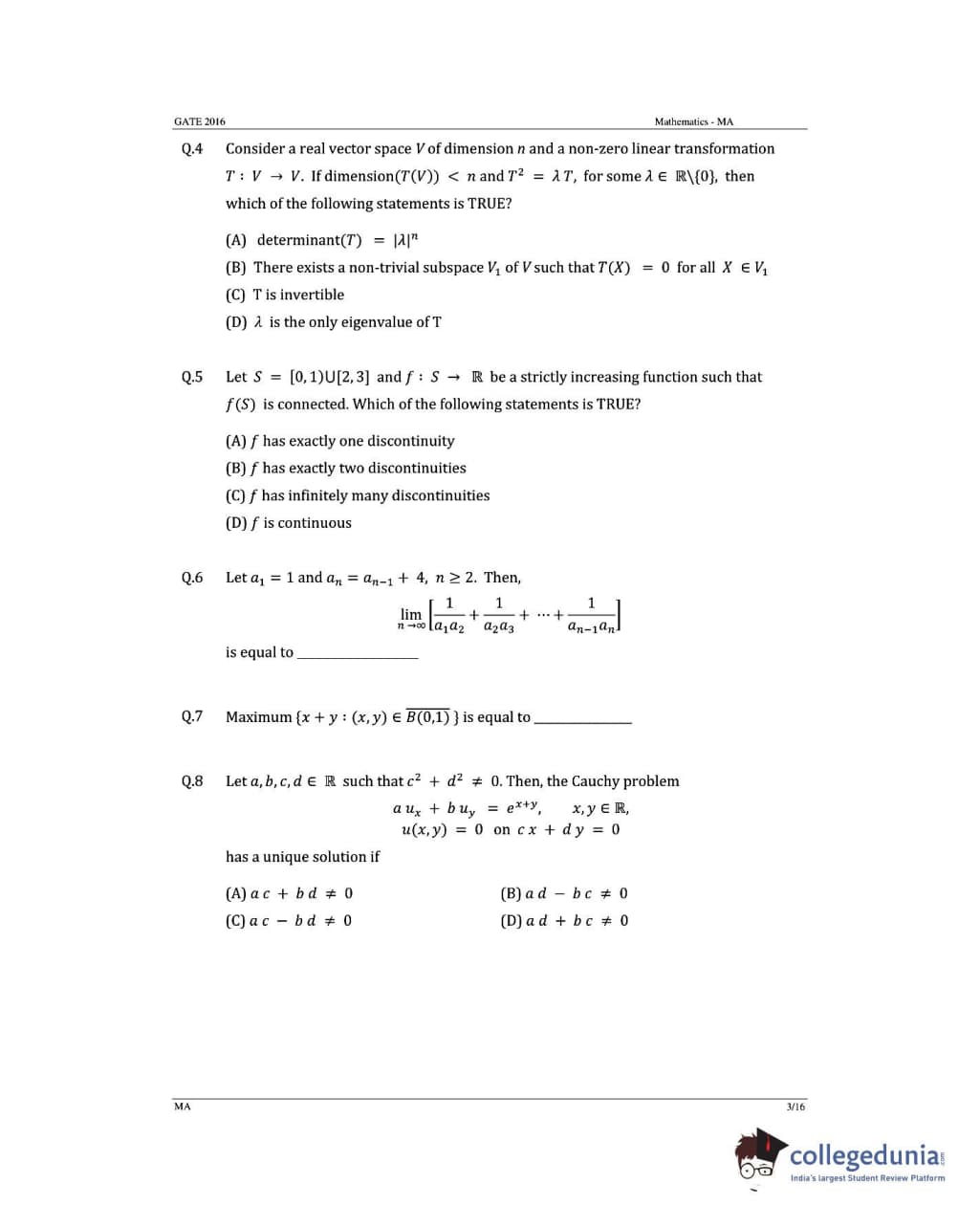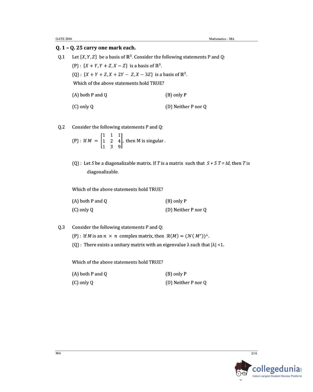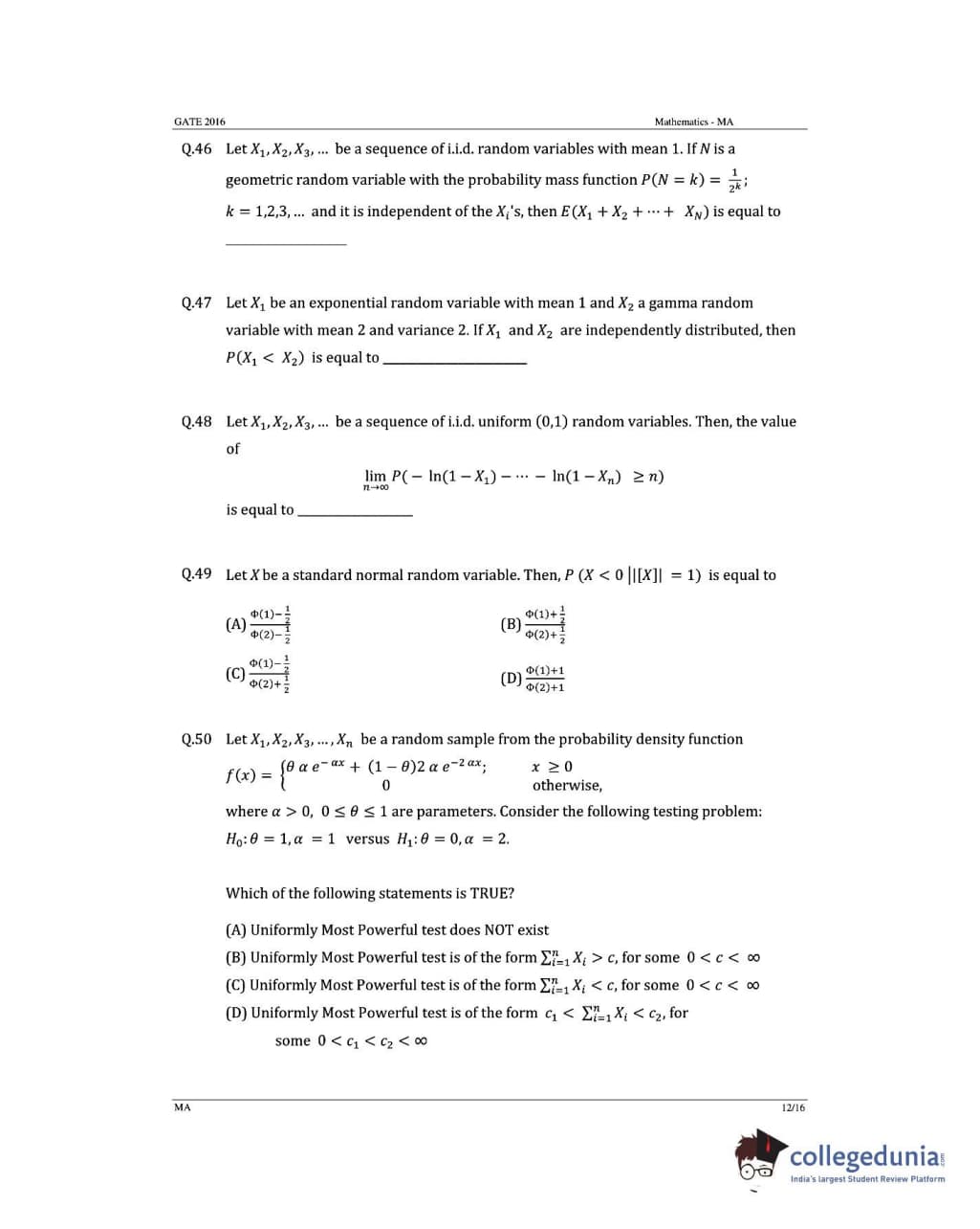 GATE 2016 Mathematics (MA) Question Paper with Answer Key PDFs (January 31- Afternoon Session)