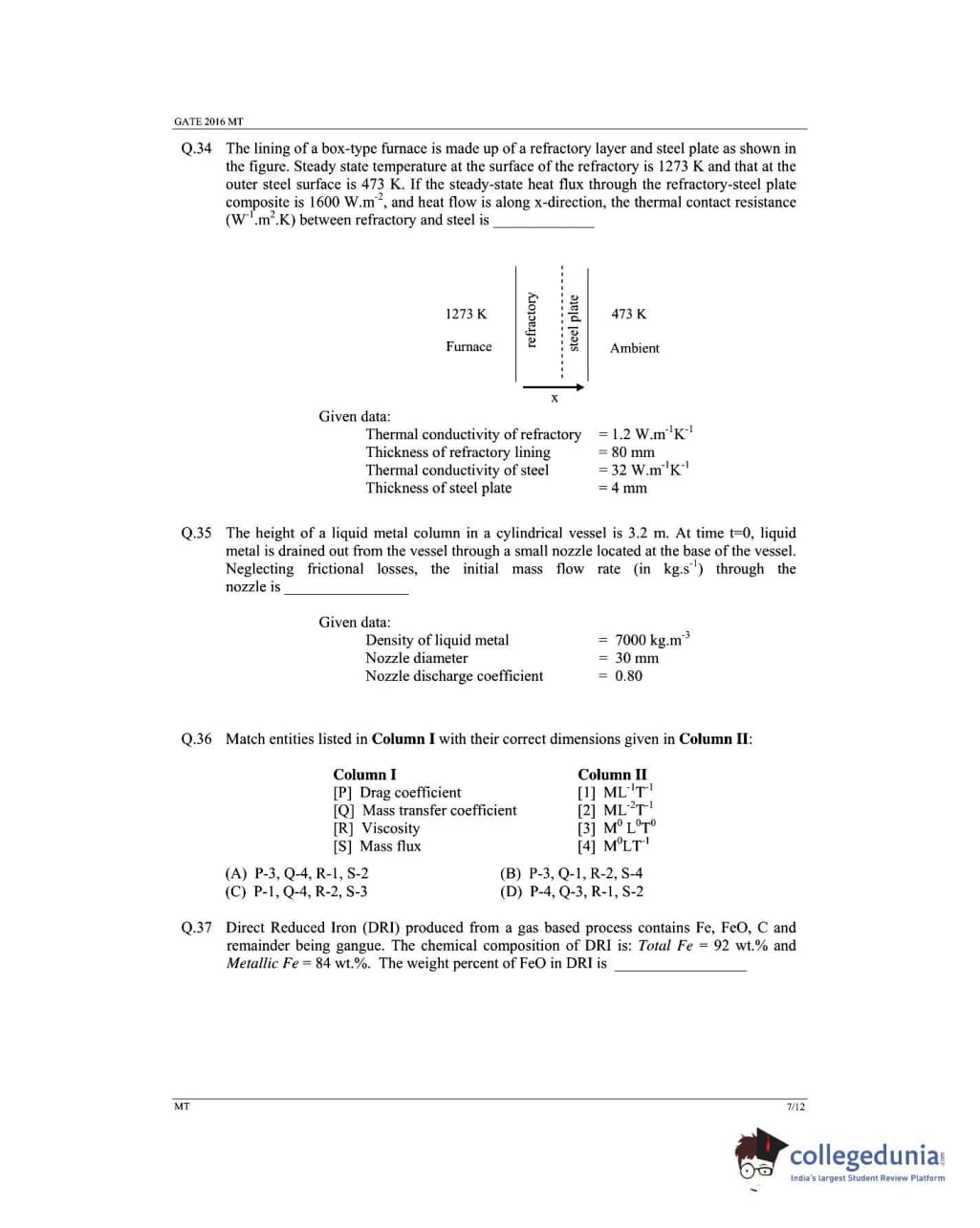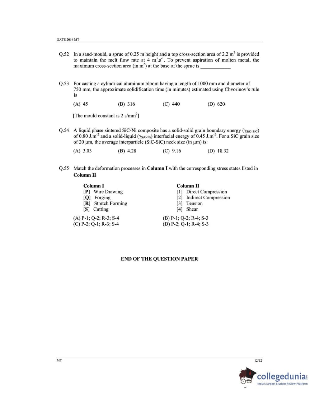 GATE 2016 MT Question Paper with Answer Key PDFs (February 7- Forenoon Session)