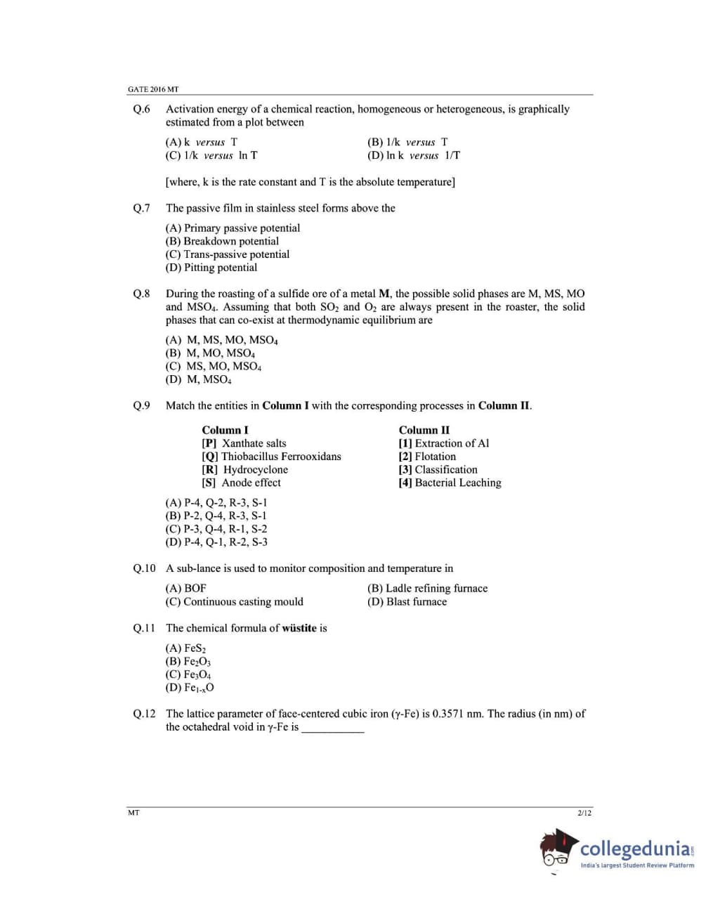 GATE Metallurgical Engineering Question Papers and Answer Key PDFs are available to download. GATE 2016 MT paper was conducted by IISc, Bangalore on February 7, 2016 in the Forenoon Session (9 AM to 12 PM). The overall difficulty level of the exam stood at average to difficult. General Aptitude had a weightage of 10% of the overall marks and was easy to attempt.