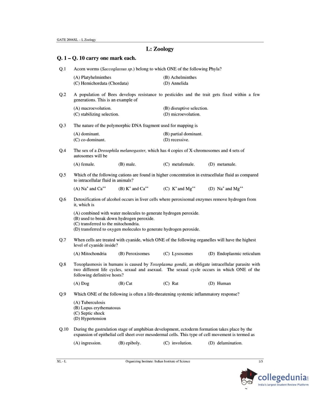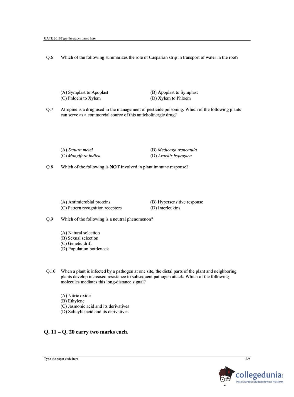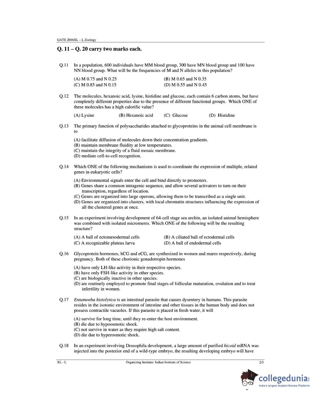 GATE 2016 Life Sciences (XL) question paper carries a total of 65 questions which are divided into 7 sections.