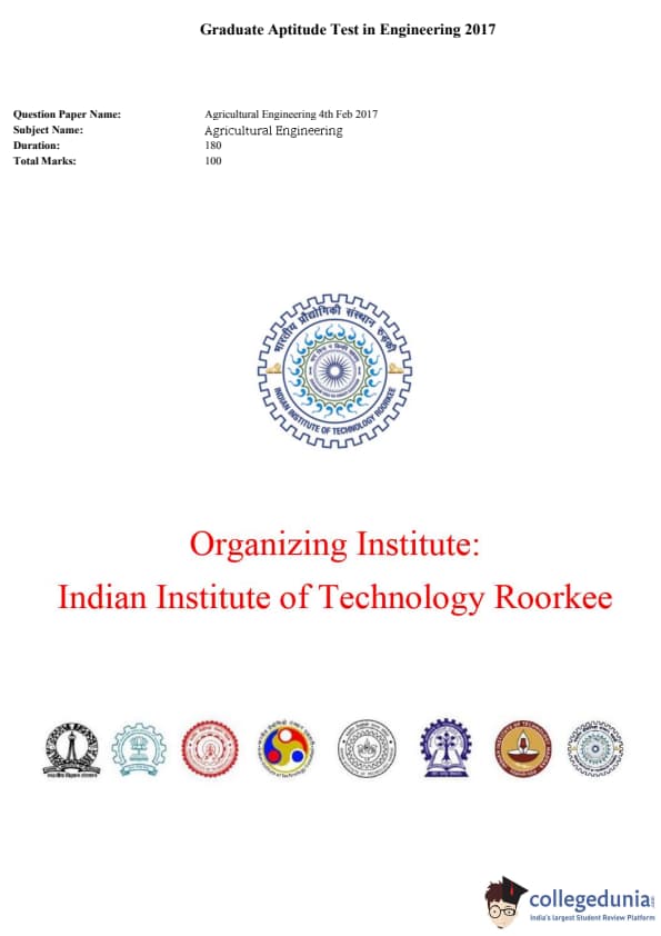 GATE 2017 Agriculture Engineering question paper with answer key PDF is available for download in the details. The exam was conducted by IIT Roorkee on February 4, 2017 in the afternoon session. According to the students' GATE 2017 AG Question paper was easy to moderate level. The exam consisted of 65 questions which were divided into 2 sections and 10 questions from general aptitude.