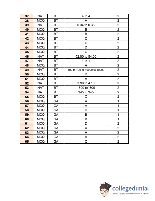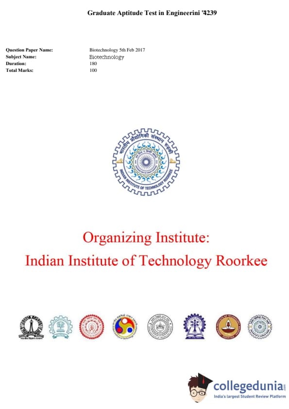 GATE 2017 Biotechnology (BT) question paper with answer key PDF is available for download in the details. The exam was conducted by IIT Roorkee on February 5, 2017 in the Forenoon session. GATE 2017 BT Question paper has said to be a moderate level of difficulty. The exam consisted of 65 questions which were divided into 3 sections Out of which 10 questions are from General Aptitude.