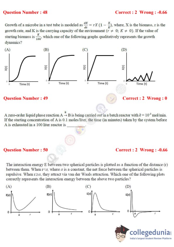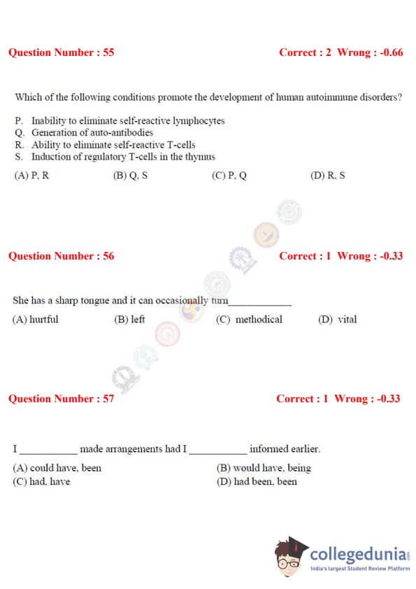 The exam consisted of two types of question patterns i.e MCQ (Multiple Choice Question) and NAT (Numerical Multiple Type) and 10 questions were from general aptitude. The total marks of the GATE BT 2017 were 100.