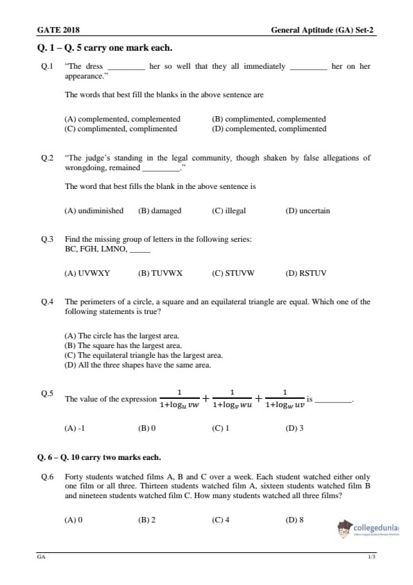- 10 MCQs questions appeared from the General Aptitude section, carrying 15 marks.