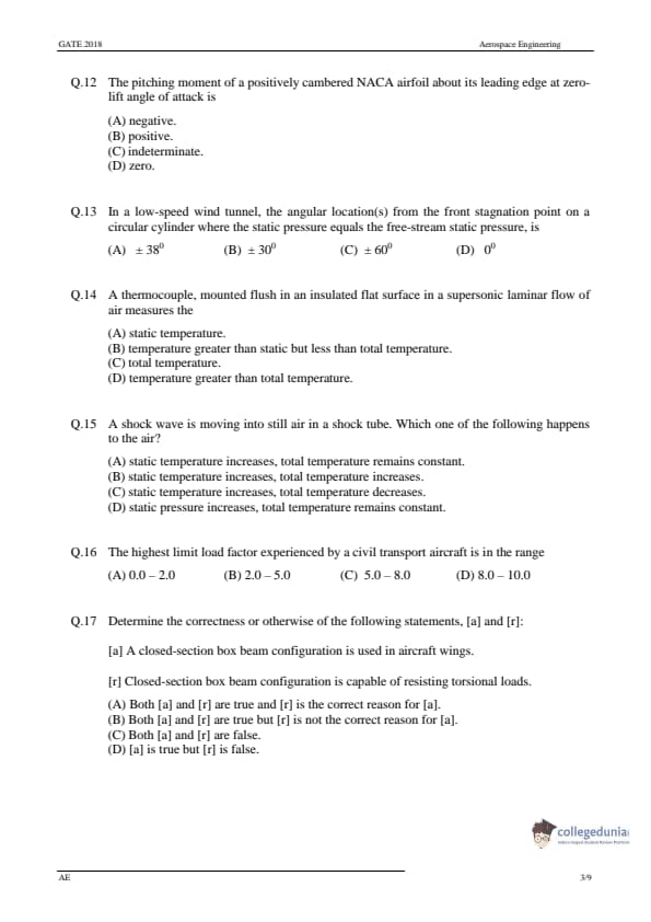 GATE 2018 Aerospace Engineering (AE) Question Paper with Answer Key for the exam conducted on February 3 in the Afternoon session (2 PM to 5 PM) is available for download. The exam was successfully organized by IIT Guwahati. In terms of difficulty level, GATE Aerospace Engineering was of moderate level. The question paper comprised a total of 65 questions.