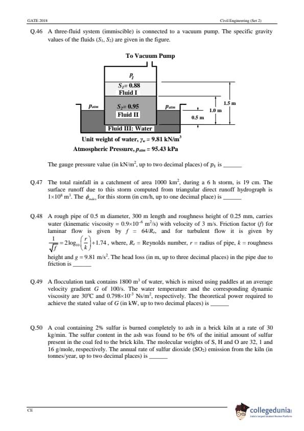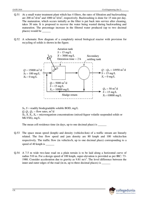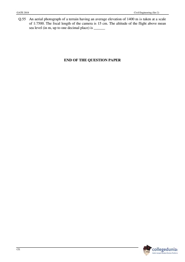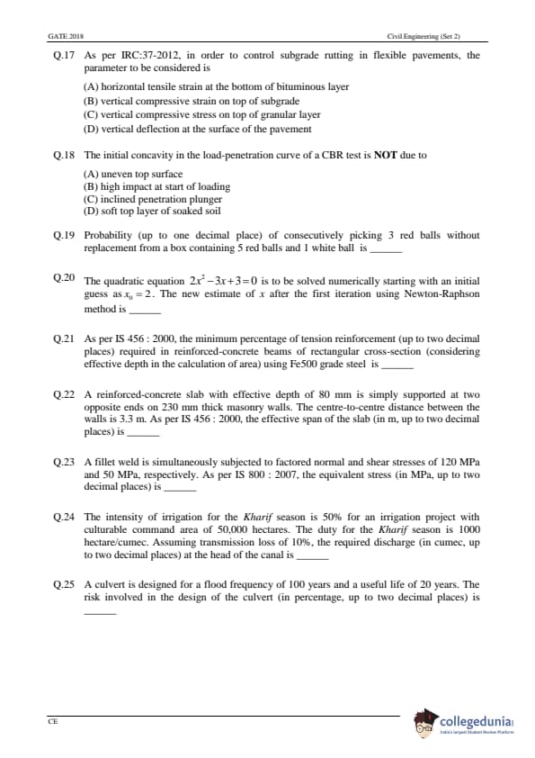 GATE 2018 CE (Civil Engineering) Question Paper with Answer key PDFs for Slot 2 are available for download. The exam was conducted by IIT Guwahati on 11 February 2018 in the afternoon session from 14:00 to 17:00 Hours (IST). GATE CE Question Paper includes questions from three sections- General Aptitude, Engineering Mathematics, and topics related to civil engineering. The General Aptitude section consists of 10 questions related to Vocabulary, Proportions, equations, etc. There were 39 MCQs and 26 NATs in GATE 2018 Question paper.